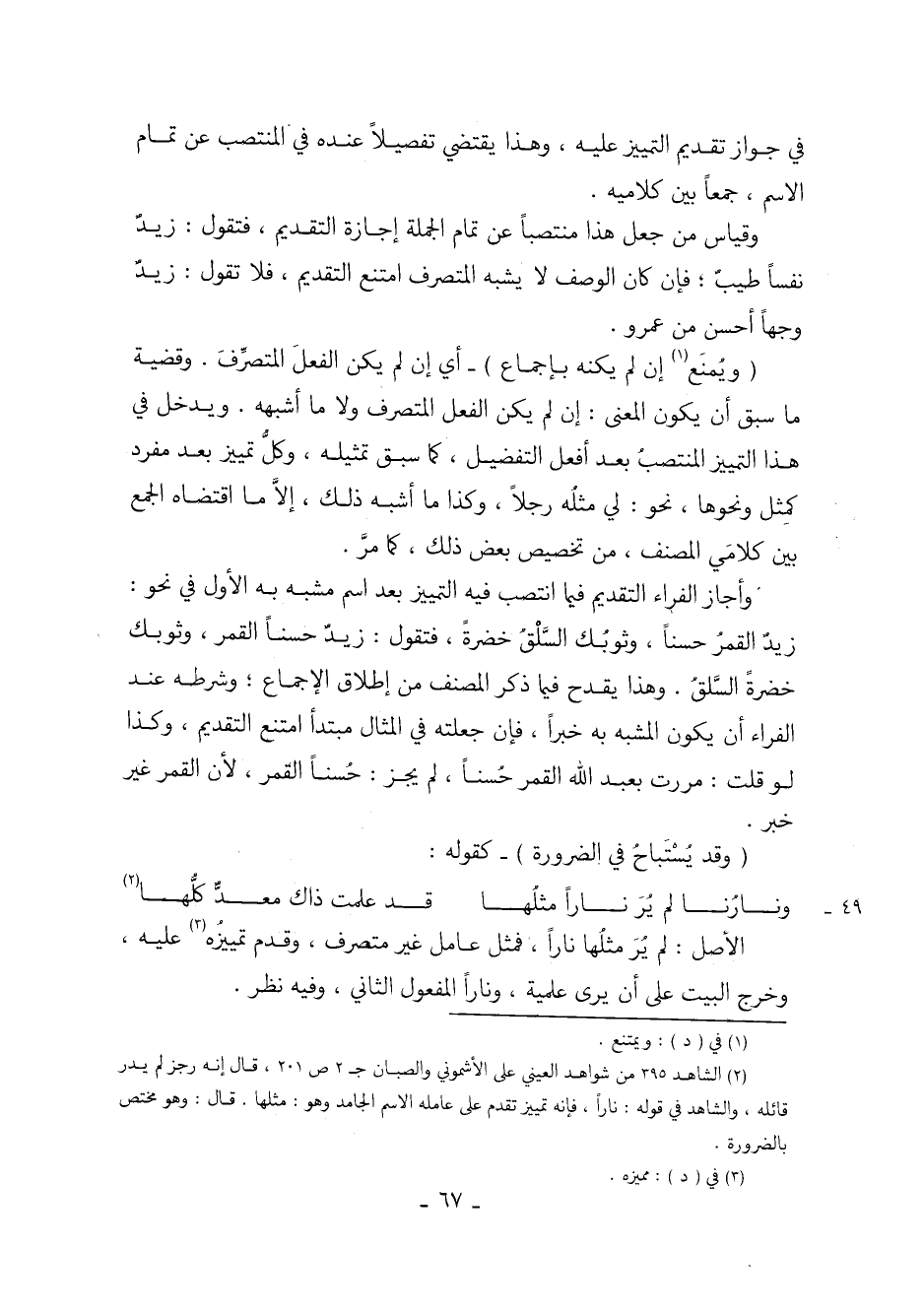 وأجاز الفراء التقديم فيما انتصب فيه التمييز بعد اسم مشبه به الأول في نحو: زيدٌ القمرُ حسناً، وثوبُك السلقُ خضرةً، فتقول: زيدٌ حسناً القمر، وثوبك خضرة السلقُ. وهذا يقدح فيما ذكر المصنف من إطلاق الإجماع؛ وشرطه عند الفراء أن يكون المشبه به خبراً، فإن جعلته في المثال مبتدأ امتنع التقديم، وكذا لو قلت: مررت بعبد الله القمر حُسناً، لم يجز: حُسناً القمر، لأن القمر غير خبر.