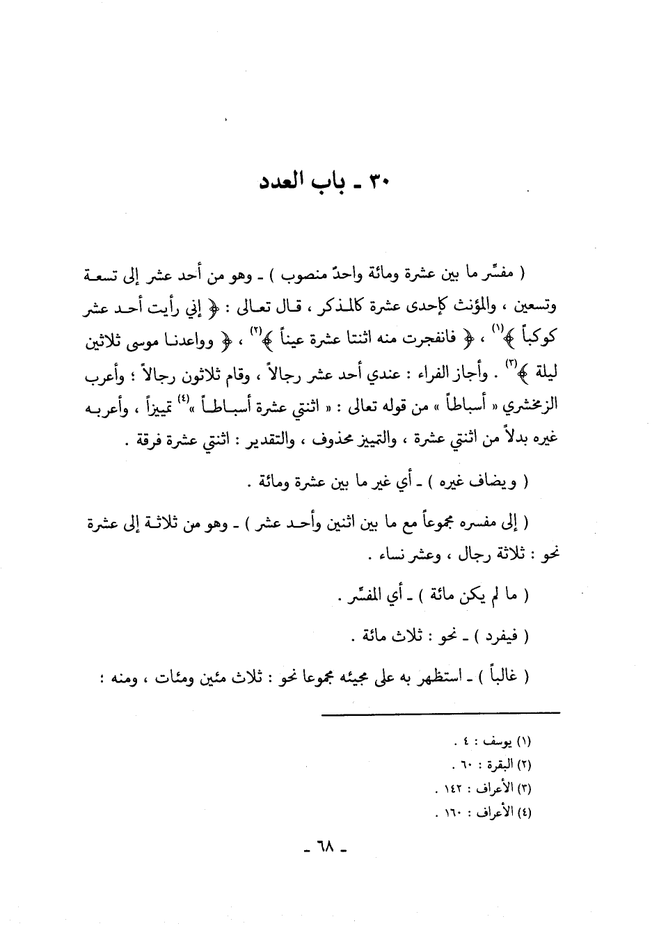(مفسر ما بين عشرة ومائة واحدٌ منصوب) - وهو من أحد عشر إلى تسعة وتسعين، والمؤنث كإحدى عشرة كالمذكر، قال تعالى: (إني رأيت أحد عشر كوكباً)، (فانفجرت منه اثنتا عشرة عيناً)، (وواعدنا موسى ثلاثين ليلة). وأجاز الفراء: عندي أحد عشر رجالاً، وقام ثلاثون رجالاً؛ وأعرب الزمخشري "أسباطاً" من قوله تعالى: "اثنتي عشرة أسباطاً" تمييزاً، وأعربه غيره بدلاً من اثنتي عشرة، والتمييز محذوف، والتقدير: اثنتي عشرة فرقة.