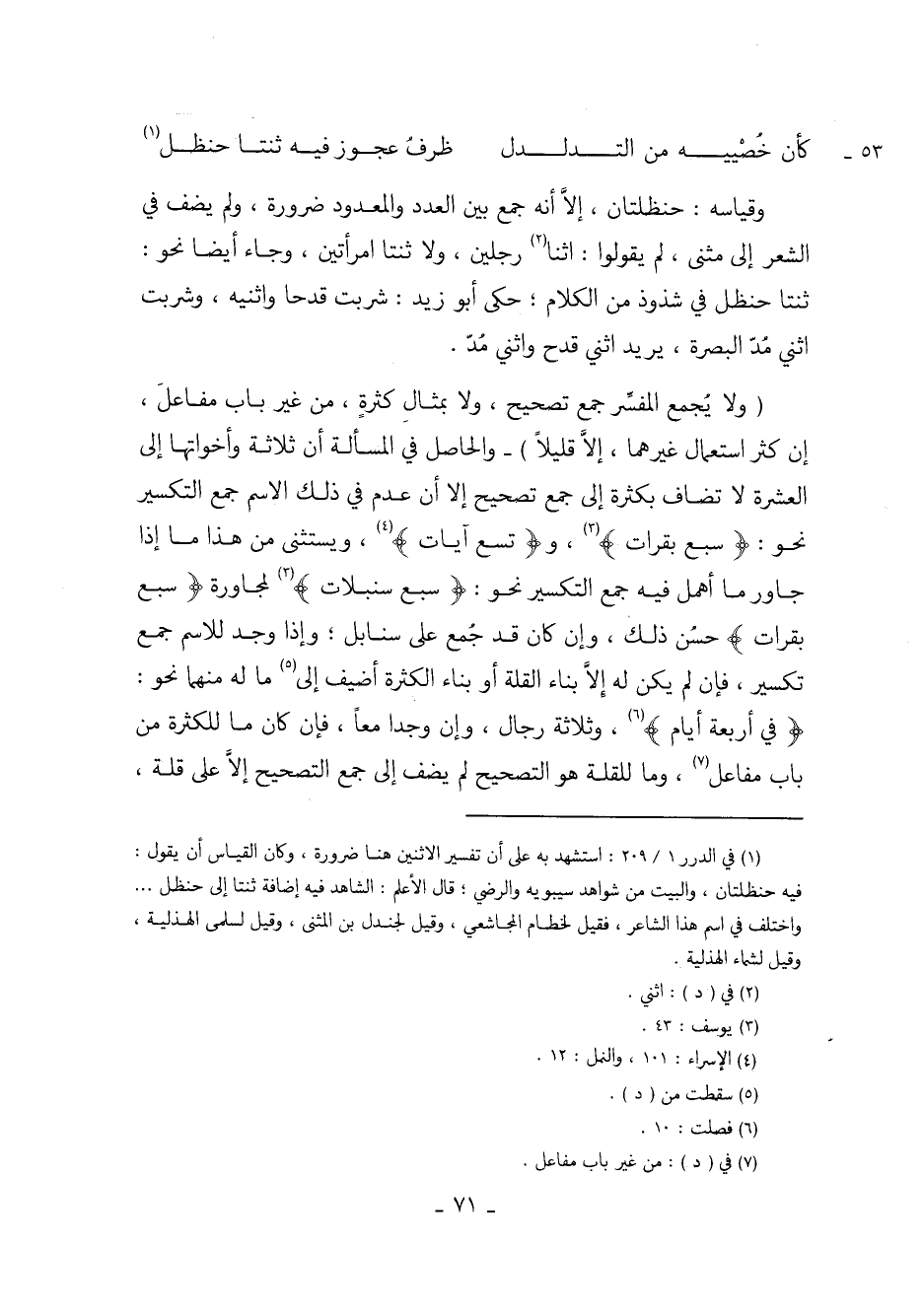 (ولا يُجمع المفسر جمع تصحيح، ولا بمثال كثرةٍ، من غير باب مفاعل، إن كثر استعمال غيرهما، إلا قليلاً) - والحاصل في المسألة أن ثلاثة وأخواتها إلى العشرة لا تضاف بكثرة إلى جمع تصحيح إلا أن عدم في ذلك الاسم جمع التكسير نحو: (سبع بقرات)، و (تسع آيات)، ويستثنى من هذا ما إذا جاور ما أهمل فيه جمع التكسير نحو: (سبع سنبلات) لمجاورة (سبع بقرات) حسُن ذلك، وإن كان قد جُمع على سنابل؛ وإذا وجد للاسم جمع تكسير، فإن لم يكن له إلا بناء القلة أو بناء الكثرة أضيف إلى ما له منهما نحو: (في أربعة أيام)، وثلاثة رجال، وإن وجدا معاً، فإن كان ما للكثرة من باب مفاعل، وما للقلة هو التصحيح لم يضف إلى جمع التصحيح إلا على قلة،