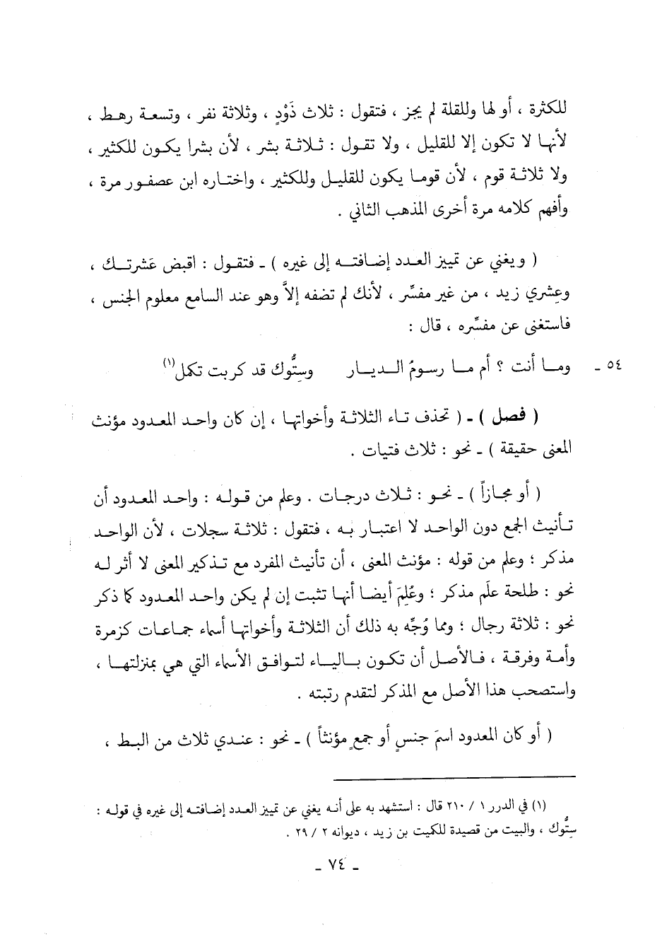 (أو مجازاً) - نحو: ثلاث درجات. وعلم من قوله: واحد المعدود أن تأنيث الجمع دون الواحد لا اعتبار به، فتقول: ثلاثة سجلات، لأن الواحد مذكر؛ وعلم من قوله: مؤنث المعنى، أن تأنيث المفرد مع تذكير المعنى لا أثر له نحو: طلحة علَم مذكر؛ وعُلِمَ أيضاً أنها تثبت إن لم يكن واحد المعدود كما ذكر نحو: ثلاثة رجال؛ ومما وُجه به ذلك أن الثلاثة وأخواتها أسماء جماعات كزمرة وأمة وفرقة، فالأصل أن تكون بالياء لتوافق الأسماء التي هي بمنزلتها، واستصحب هذا الأصل مع المذكر لتقدم رتبته.