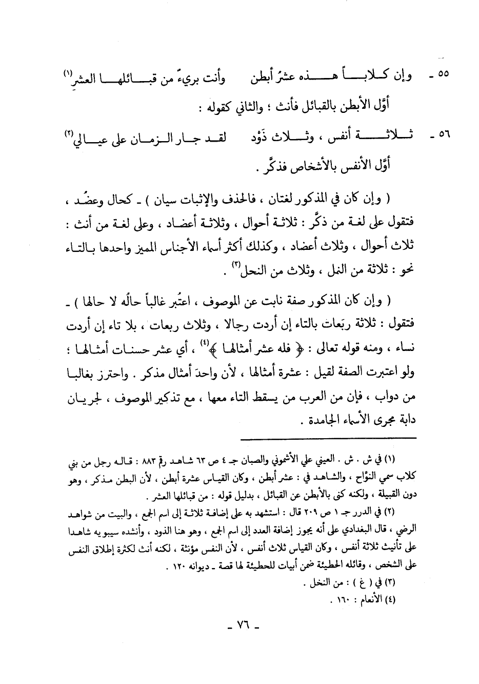 (وإن كان المذكور صفة نابت عن الموصوف، اعتُبر غالباً حاله لا حالها) - فتقول: ثلاثة ربعات بالتاء إن أردت رجالاً، وثلاث ربعات، بلا تاء إن أردت نساء، ومنه قوله تعالى: (فله عشر أمثالها)، أي عشر حسنات أمثالها؛ ولو اعتبرت الصفة لقيل: عشرة أمثالها، لأن واحد أمثال مذكر. واحترز بغالباً من دواب، فإن من العرب من يسقط التاء معها، مع تذكير الموصوف، لجريان دابة مجرى الأسماء الجامدة.
