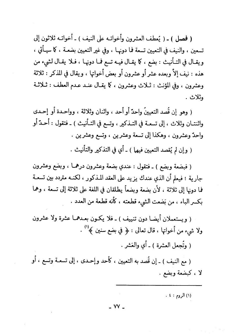 (فصل) - (يُعطف العشرون وأخواته على النيف) - أخواته ثلاثون إلى تسعين، والنيف في التعيين تسعة فما دونها، وفي غير التعيين بضعة، كما سيأتي، ويقال في التأينث: بضع، كما يقال فيه تسع فما دونها، فلا يقال لشيء من هذه: نيف إلا وبعده عشر أو عشرون أو بعض أخواتها، ويقال في المصذكر: ثلاثة وعشرون، وفي المؤنث: ثلاث وعشرون، كما يقال عند عدم العطف: ثلاثة وثلاث.