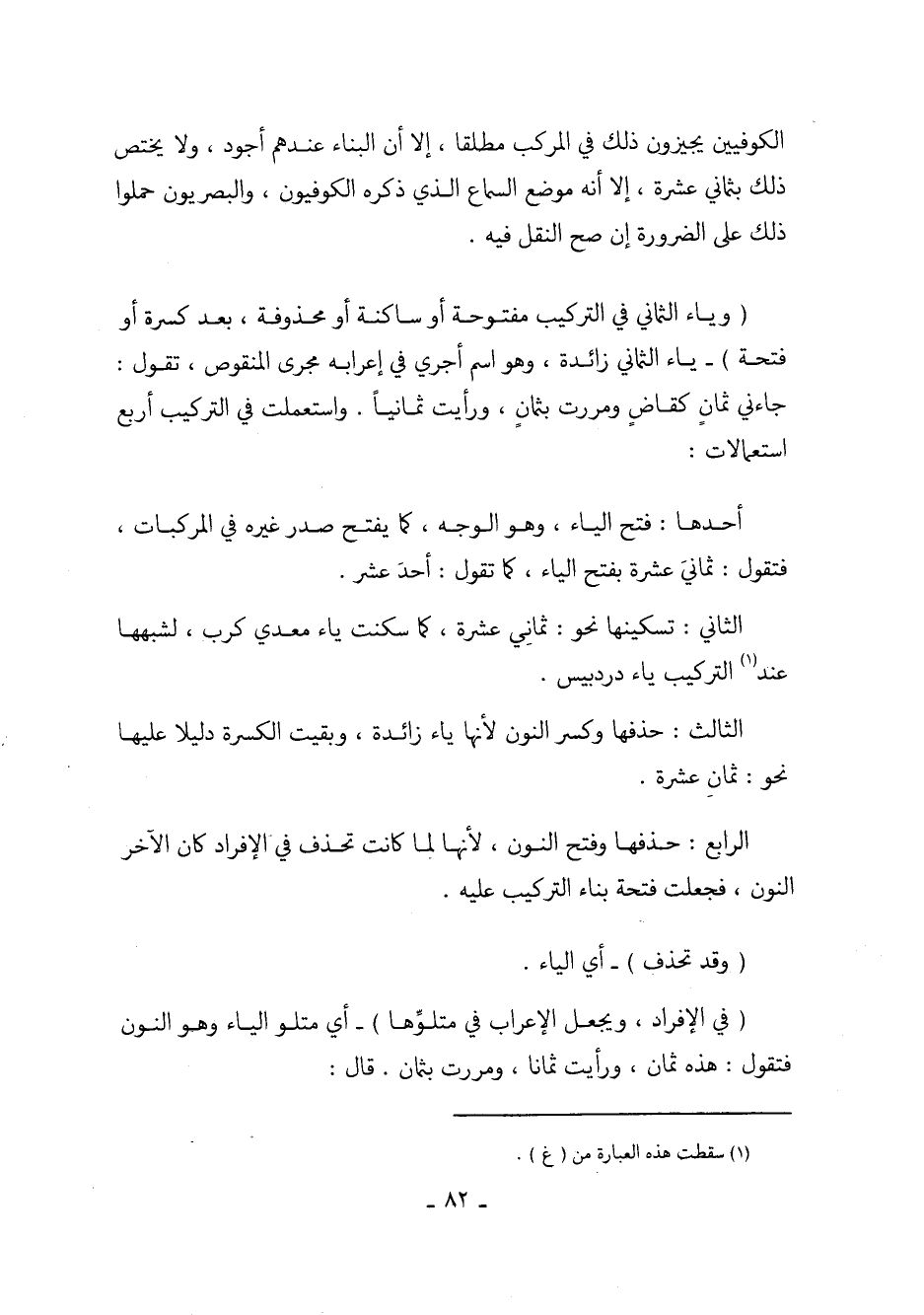 الثاني: تسكينها نحو: ثماني عشرة، كما سكنت ياء معدي كرب، لشبهها عند التركيب ياء دردبيس.