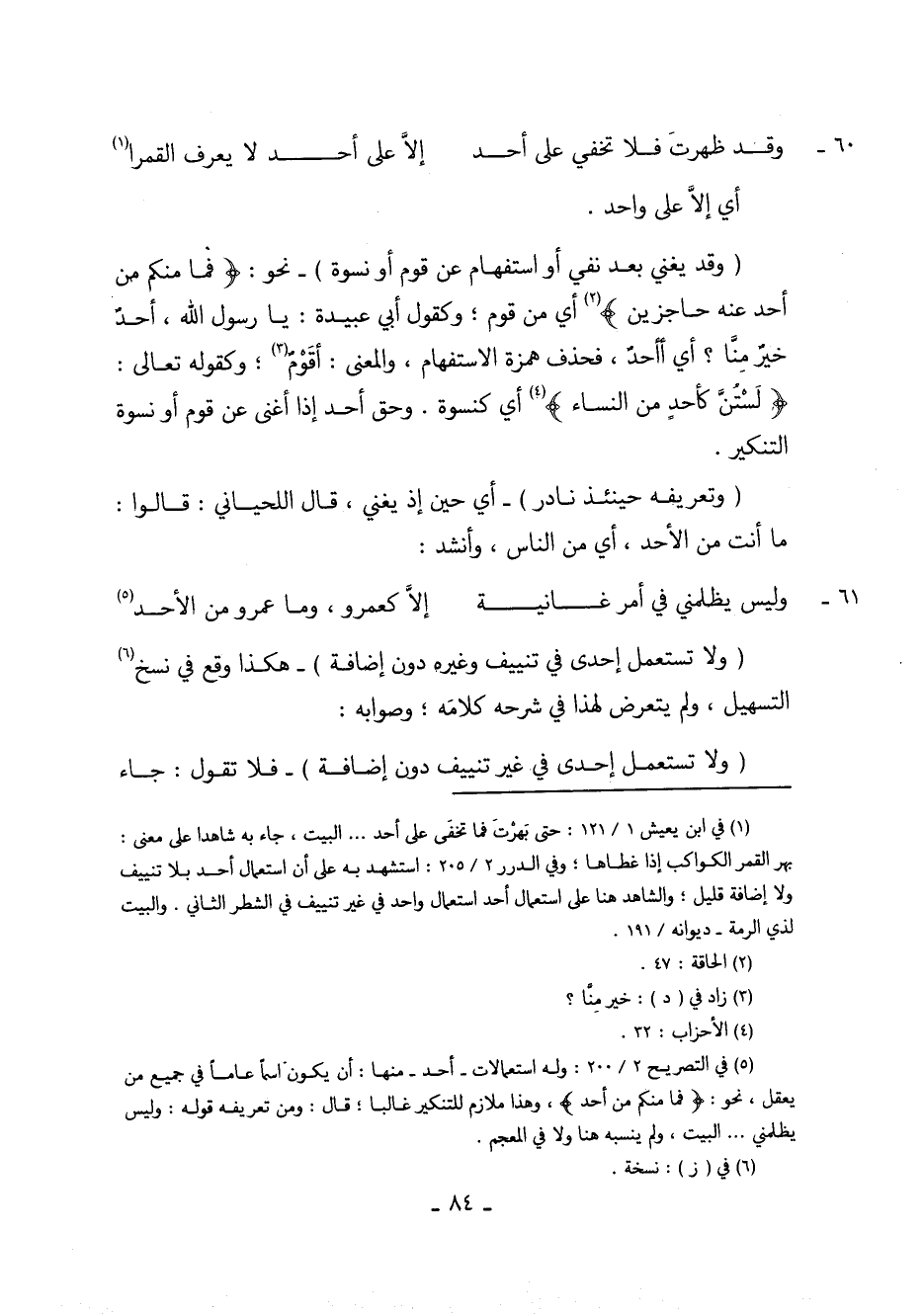 (وقد يغني بعد نفي أو استفهام عن قوم أو نسوة) - نحو: (فما منكم من أحد عنه حاجزين) أي من قوم؛ وكقول أبي عبيدة: يا رسول الله، أحد خيرٌ منا؟ أي أأحدٌ، فحذف همزة الاستفهام، والمعنى: أقومٌ؛ وكقوله تعالى: (لستُن كأحد من النساء) أي كنسوة. وحق أحد إذا أغنى عن قوم أو نسوة التنكير.