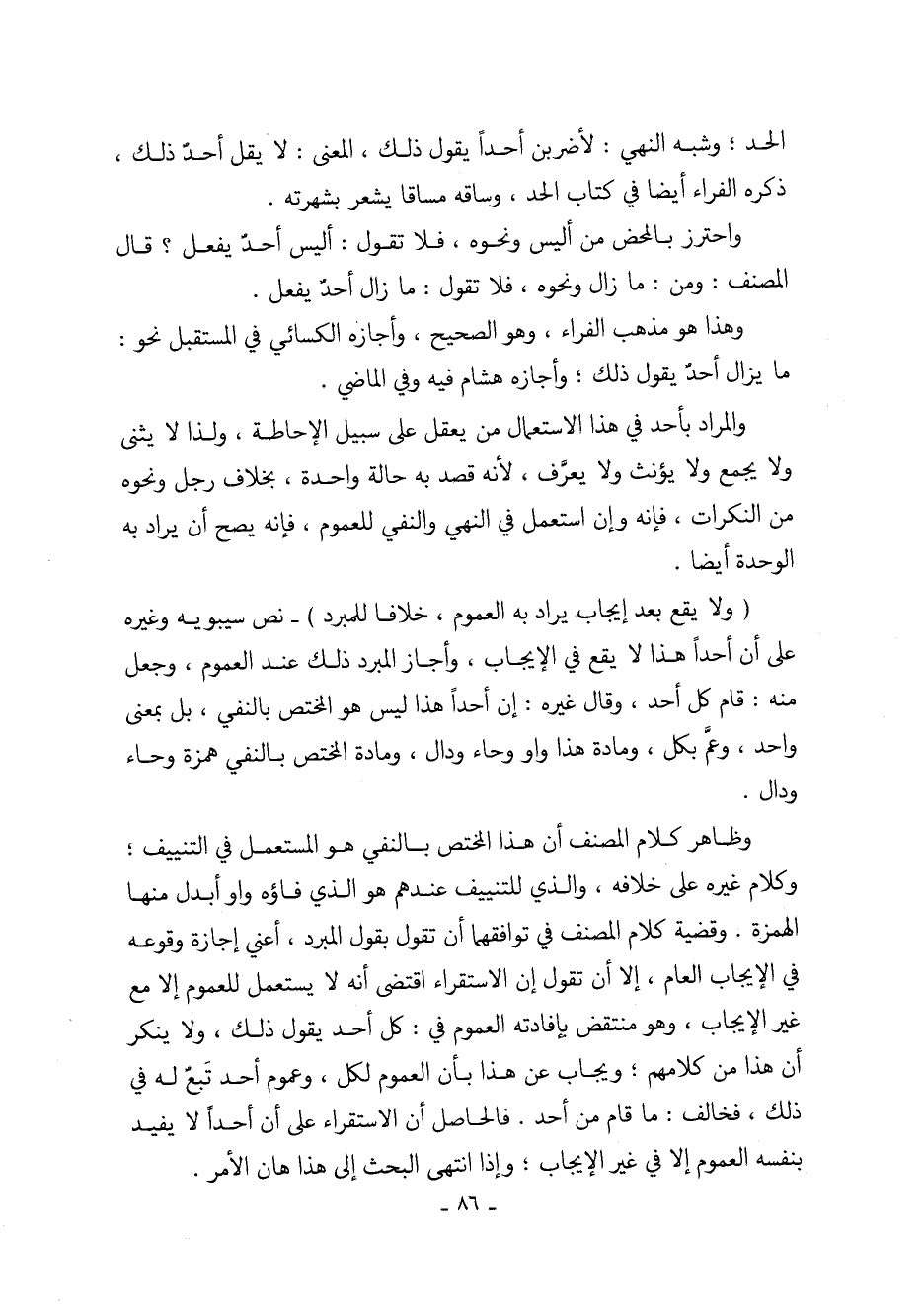 وظاهر كلام المصنف ان هذا المختص بالنفي هو المستعمل في التنييف؛ وكلام غيره على خلافه، والذي للتنييف عندهم هو الذي فاؤه واو أبدل منها الهمزة. وقضية كلام المصنف في توافقهما أن تقول بقول المبرد، أعني إجازة وقوعه في الإيجاب العام، إلا أن تقول إن الاستقراء اقتضى أنه لا يستعمل للعموم إلا مع غير الإيجاب، وهو منتقض بإفادته العموم في: كل أحد يقول ذلك، ولا ينكر أن هذا من كلامهم؛ ويجاب عن هذا بأن العموم لكل، وعموم أحد تبع له في ذلك، فخالف: ما قام من أحد. فالحاصل أن الاستقراء على أن أحداً لا يفيد بنفسه العموم إلا في غير الإيجاب؛ وإذا انتهى البحث إلى هذا هان الأمر.