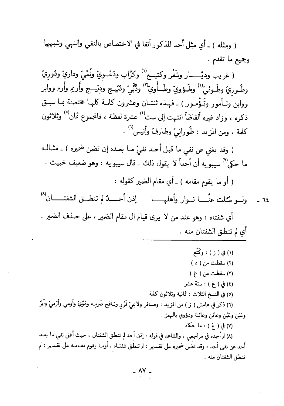 (وقد يغني عن نفي ما قبل أحد نفيُ ما بعده إن تضمن ضميره) - مثاله ما حكى سيبويه أن أحداً لا يقول ذلك. قال سيبويه: وهو ضعيف خبيث.