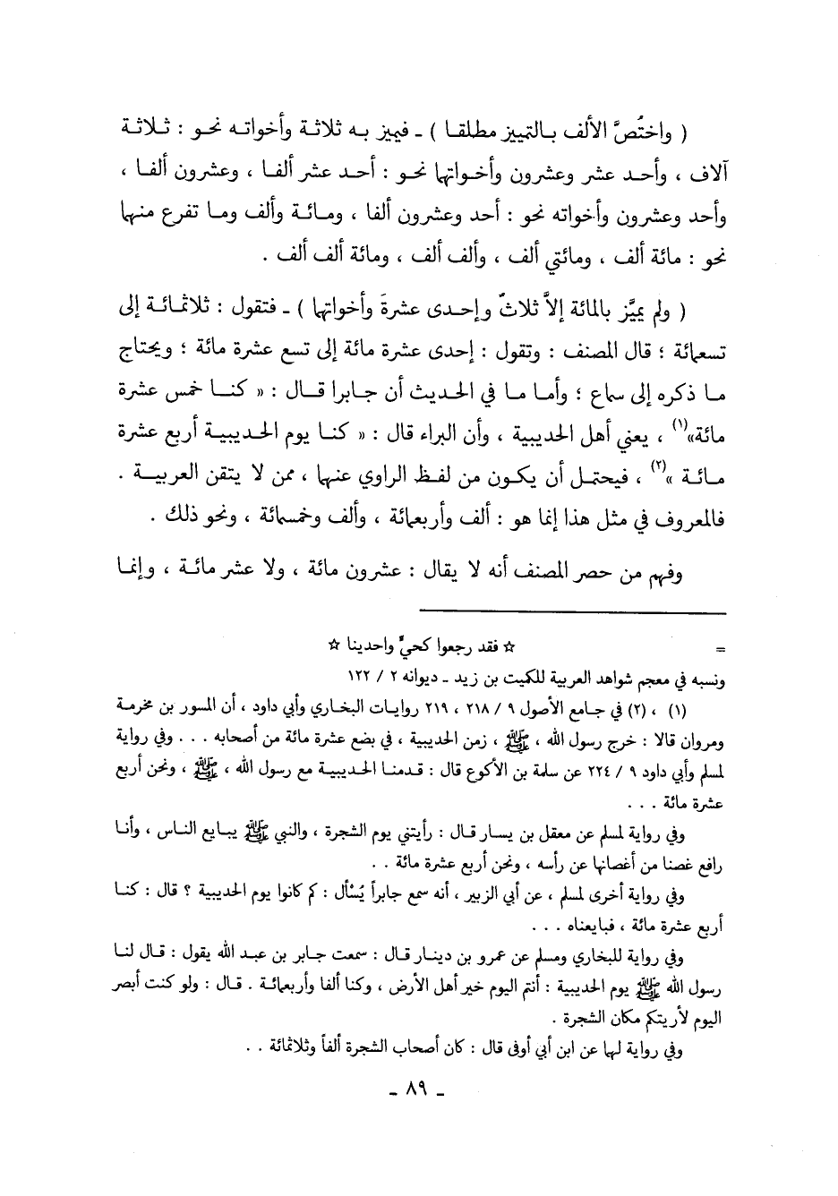 (ولم يميز بالمائة إلا ثلاث وإحدى عشرة وأخواتهما) - فتقول: ثلاثمائة إلى تسعمائة؛ قال المصنف: وتقول: إحدى عشرة مائة إلى تسع عشرة مائة؛ ويحتاج ما ذكره إلى سماع؛ وأما ما في الحديث أن جابراً قال: "كنا خمس عشرة مائة"، يعني أهل الحديبية، وأن البراء قال: "كنا يوم الحديبية أربع عشرة مائة"، فيحتمل أن يكون من لفظ الراوي عنهما، ممن لا يتقن العربية. فالمعروف في مثل هذا إنما هو: ألف وأربعمائة، وألف وخمسمائة، ونحو ذلك.