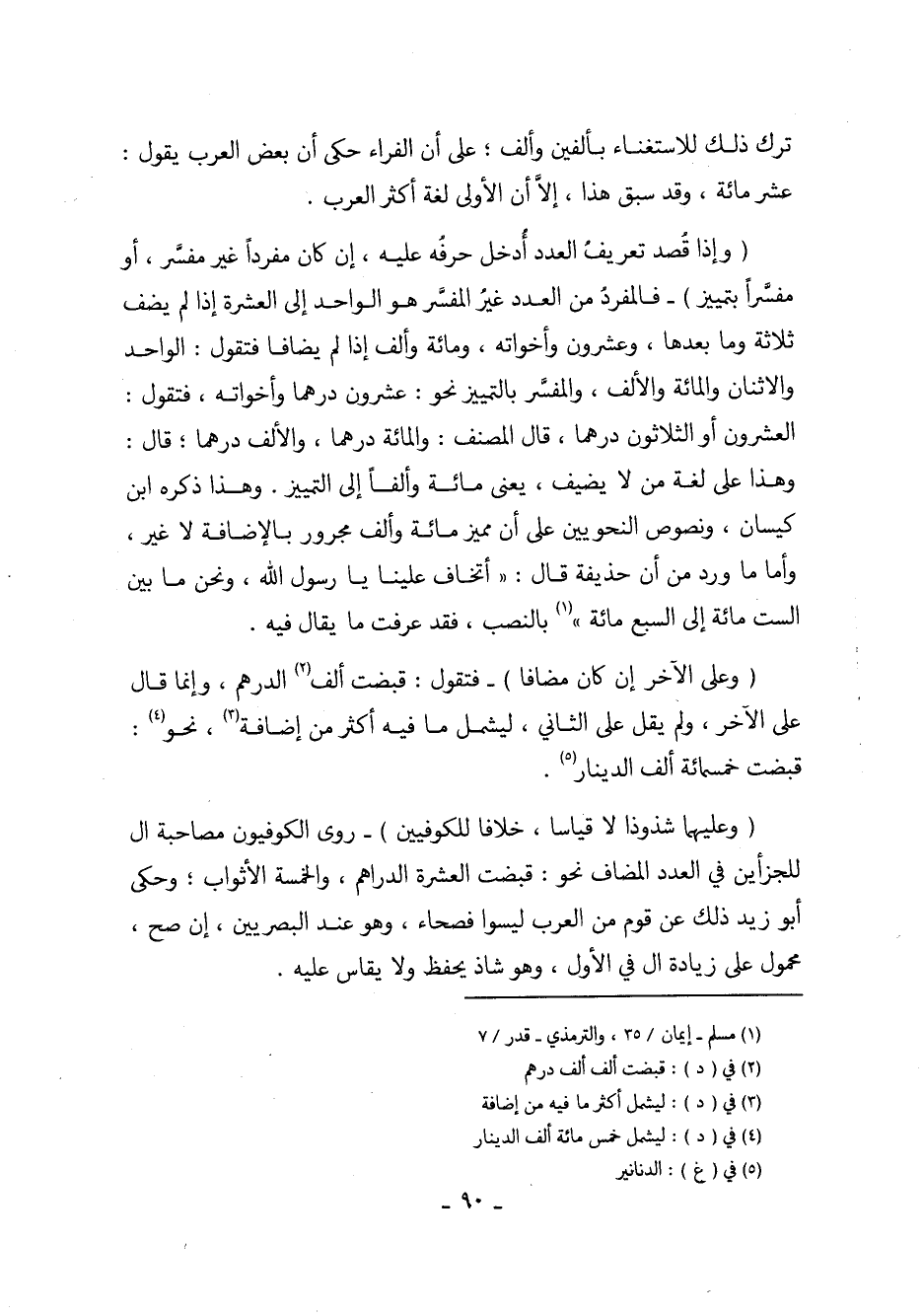 (وعلى الآخر إن كان مضافاً) - فتقول: قبضت ألف الدرهم، وإنما قال على الآخر، ولم يقل على الثاني، ليشمل ما فيه أكثر من إضافة، نحو: قبضت خمسمائة ألف الدينار.