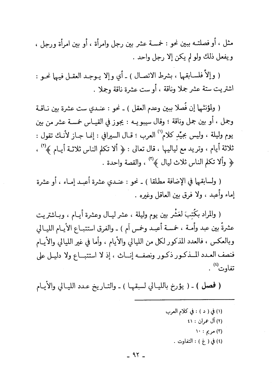 (ولمؤنثهما إن فُصلا ببين وعدم العقل) - نحو: عندي ست عشرة بين ناقة وجمل، أو بين جمل وناقة؛ وقال سيبويه: يجوز في القياس خمسة عشر من بين يوم وليلة، وليس بجيد كلام العرب؛ قال السيرافي: إنما جاز لأنك تقول: ثلاثة أيام، وتريد مع لياليها، قال تعالى: (ألا تكلم الناس ثلاثة أيام)، (وألا تكلم الناس ثلاث ليال)، والقصة واحدة.