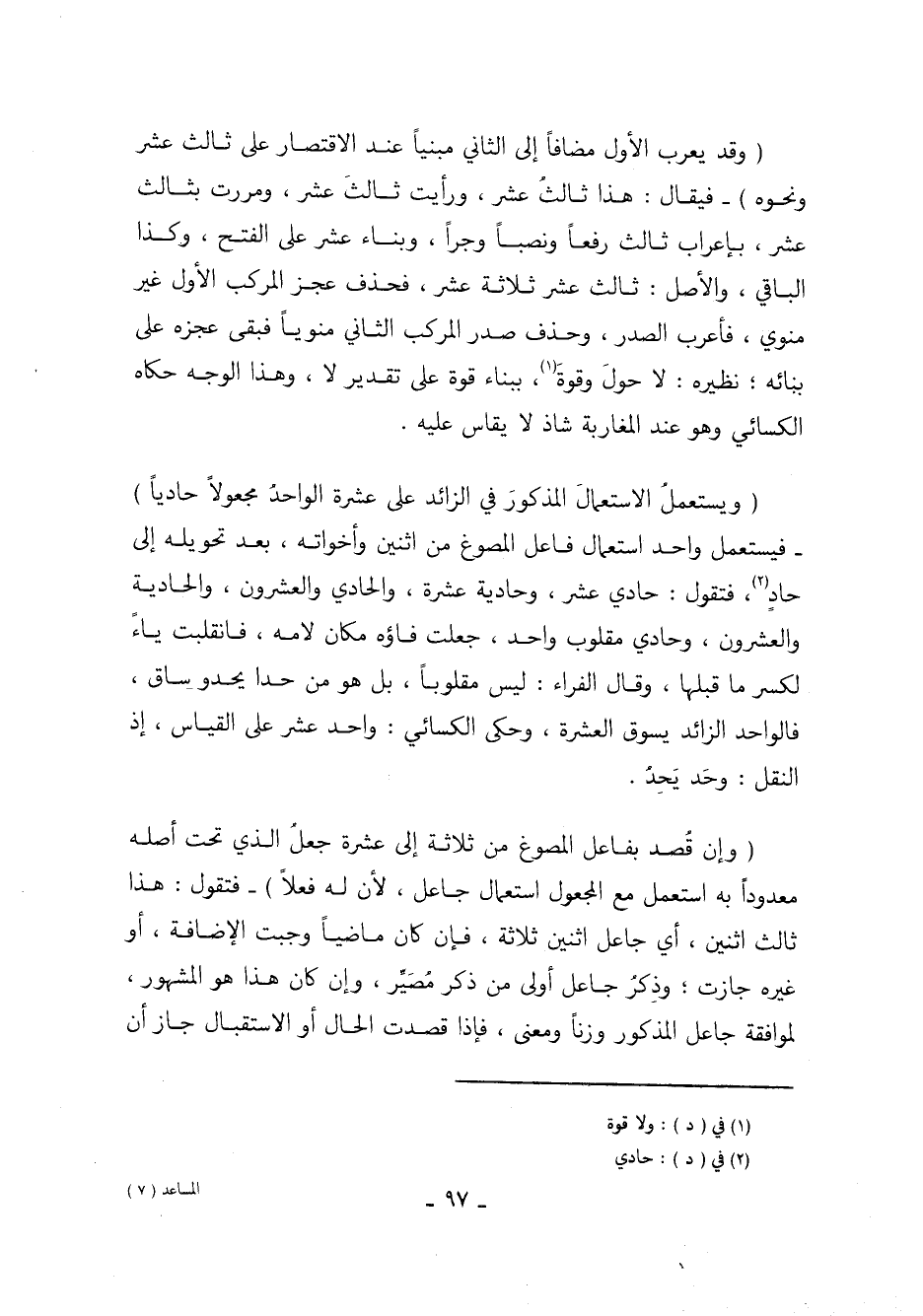 (ويستعملُ الاستعمال المذكور في الزائد على عشرة الواحدُ مجعولاً حادياً) - فيستعمل واحد استعمال فاعل المصوغ من اثنين وأخواته، بعد تحويله إلى حادٍ، فتقول: حادي عشر، وحادية عشرة، والحادي والعشرون، والحادية والعشرون، وحادي مقلوب واحد، جعلت فاؤه مكان لامه، فانقلبت ياء لكسر ما قبلها، وقال الفراء: ليس مقلوباً، بل هو من حدا يحدو ساق، فالواحد الزائد يسوق العشرة، وحكى الكسائي: واحد عشر على القياس، إذ النقل: وحَد يَحِدُ.