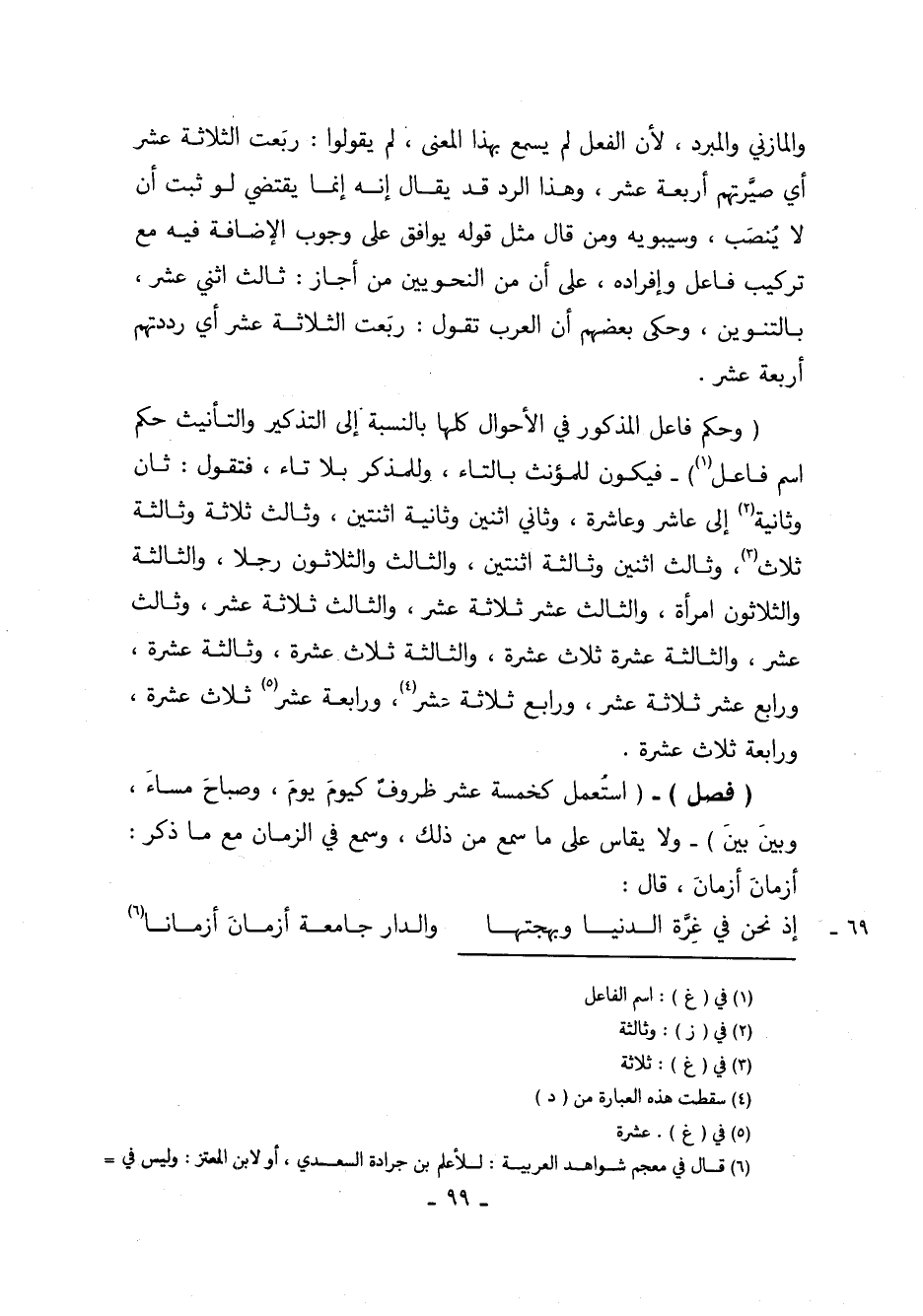 والمازني والمبرد، لأن الفعل لم يسمع بهذا المعنى، لم يقولوا: ربعت الثلاثة عشر أي صيرتهم أربعة عشر، وهذا الرد قد يقال إنه إنما يقتضي لو ثبت أن لا يُنصب، وسيبويه ومن قال مثل قوله يوافق على وجوب الإضافة فيه مع تركيب فاعل وإفراده، على أن من النحويين من أجاز: ثالث اثني عشر، بالتنوين، وحكى بعضهم أن العرب تقول: ربعت الثلاثة عشر أي رددتهم أربعة عشر.