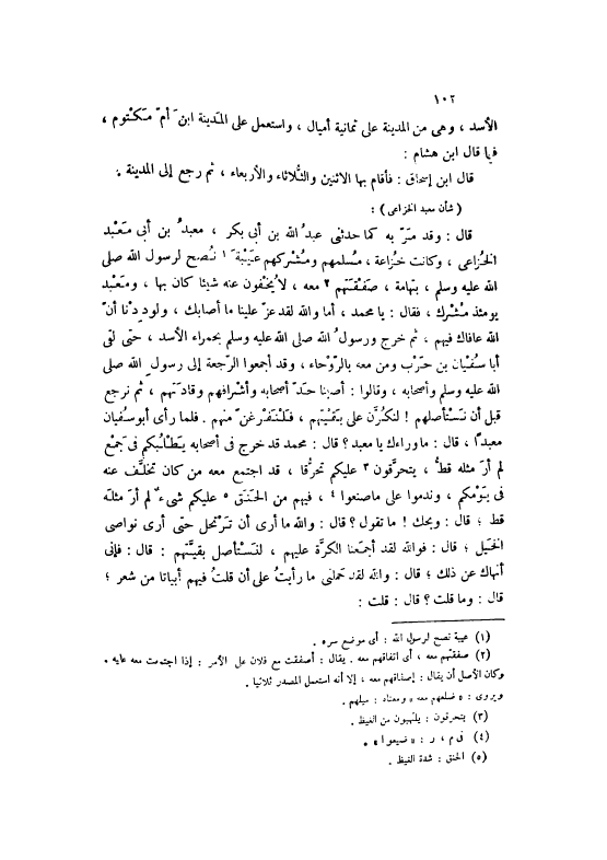 قَالَ: وَقَدْ مَرَّ بِهِ كَمَا حَدَّثَنِي عَبْدُ اللَّهِ بْنُ أَبِي بَكْرٍ، مَعْبَدُ بْنُ أَبِي مَعْبَدٍ الْخُزَاعِيُّ، وَكَانَتْ خُزَاعَةُ، مُسْلِمُهُمْ وَمُشْرِكُهُمْ عَيْبَةَ [1] نُصْحٍ لِرَسُولِ اللَّهِ صَلَّى اللهُ عَلَيْهِ وَسَلَّمَ، بِتِهَامَةَ، صَفْقَتُهُمْ [2] مَعَهُ، لَا يُخْفُونَ عَنْهُ شَيْئًا كَانَ بِهَا، وَمَعْبَدٌ يَوْمَئِذٍ مُشْرِكٌ، فَقَالَ: يَا مُحَمَّدُ، أَمَا وَاَللَّهِ لَقَدْ عَزَّ عَلَيْنَا مَا أَصَابَكَ، وَلَوَدِدْنَا أَنَّ اللَّهَ عَافَاكَ فِيهِمْ، ثُمَّ خَرَجَ وَرَسُولُ اللَّهِ صَلَّى اللهُ عَلَيْهِ وَسَلَّمَ بِحَمْرَاءِ الْأَسَدِ، حَتَّى لَقِيَ أَبَا سُفْيَانَ بْنَ حَرْبٍ وَمَنْ مَعَهُ بِالرَّوْحَاءِ، وَقَدْ أَجْمَعُوا الرَّجْعَةَ إلَى رَسُولِ اللَّهِ صَلَّى اللهُ عَلَيْهِ وَسَلَّمَ وَأَصْحَابِهِ، وَقَالُوا: أَصَبْنَا حَدَّ أَصْحَابِهِ وَأَشْرَافَهُمْ وَقَادَتَهُمْ، ثُمَّ نَرْجِعُ قَبْلَ أَنْ نَسْتَأْصِلَهُمْ! لَنَكُرَنَّ عَلَى بَقِيَّتِهِمْ، فَلَنَفْرُغَنَّ مِنْهُمْ. فَلَمَّا رَأَى أَبُو سُفْيَانَ مَعْبَدًا، قَالَ: مَا وَرَاءَكَ يَا مَعْبَدُ؟ قَالَ: مُحَمَّدٌ قَدْ خَرَجَ فِي أَصْحَابِهِ يَطْلُبُكُمْ فِي جَمْعٍ لَمْ أَرَ مِثْلَهُ قَطُّ، يَتَحَرَّقُونَ [3] عَلَيْكُمْ تَحَرُّقًا، قَدْ اجْتَمَعَ مَعَهُ مَنْ كَانَ تَخَلَّفَ عَنْهُ فِي يَوْمِكُمْ، وَنَدِمُوا عَلَى مَا صَنَعُوا [4] ، فِيهِمْ مِنْ الْحَنَقِ [5] عَلَيْكُمْ شَيْءٌ لَمْ أَرَ مِثْلَهُ قَطُّ، قَالَ: وَيْحكَ! مَا تَقُولُ؟ قَالَ: وَاَللَّهِ مَا أَرَى أَنْ تَرْتَحِلَ حَتَّى أَرَى نَوَاصِيَ الْخَيل، قَالَ: فو الله لَقَدْ أَجْمَعْنَا الْكَرَّةَ عَلَيْهِمْ، لِنَسْتَأْصِلَ بَقِيَّتَهُمْ: قَالَ: فَإِنِّي أَنْهَاكَ عَنْ ذَلِكَ، قَالَ: وَاَللَّهِ لَقَدْ حَمَلَنِي مَا رَأَيْتُ عَلَى أَنْ قُلْتُ فِيهِمْ أَبْيَاتًا مِنْ شِعْرٍ، قَالَ: وَمَا قُلْتُ؟ قَالَ: قُلْتُ: