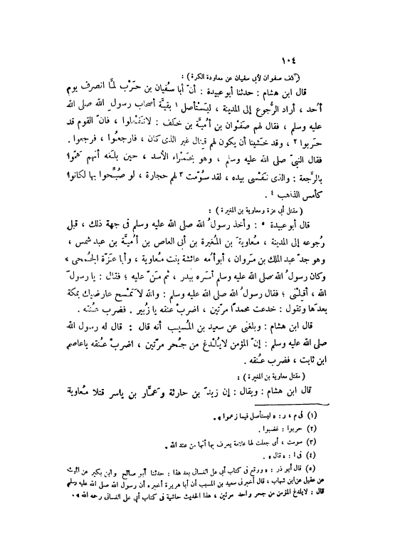 قَالَ ابْنُ هِشَامٍ: حَدَّثَنَا أَبُو عُبَيْدَةَ: أَنَّ أَبَا سُفْيَانَ بْنَ حَرْبٍ لَمَّا انْصَرَفَ يَوْمَ أُحُدٍ، أَرَادَ الرُّجُوعَ إلَى الْمَدِينَةِ، لِيَسْتَأْصِلَ [1] بَقِيَّةَ أَصْحَابِ رَسُولِ اللَّهِ صَلَّى اللهُ عَلَيْهِ وَسَلَّمَ، فَقَالَ لَهُمْ صَفْوَانُ بْنُ أُمَيَّةَ بْنِ خَلَفٍ: لَا تَفْعَلُوا، فَإِنَّ الْقَوْمَ قَدْ حَرِبُوا [2] ، وَقَدْ خَشِينَا أَنْ يَكُونَ لَهُمْ قِتَالٌ غَيْرُ الَّذِي كَانَ، فَارْجِعُوا، فَرَجَعُوا.