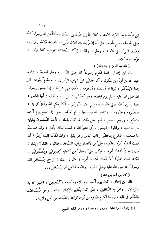 قَالَ ابْنُ إسْحَاقَ: فَلَمَّا قَدِمَ رَسُولُ اللَّهِ صَلَّى اللهُ عَلَيْهِ وَسَلَّمَ الْمَدِينَةَ، وَكَانَ عَبْدُ اللَّهِ بْنُ أُبَيِّ ابْنِ سَلُولَ، كَمَا حَدَّثَنِي ابْنُ شِهَابٍ الزُّهْرِيُّ، لَهُ مَقَامٌ يَقُومُهُ كُلَّ جُمُعَةٍ لَا يُنْكَرُ، شَرَفًا لَهُ فِي نَفْسِهِ وَفِي قَوْمِهِ، وَكَانَ فِيهِمْ شَرِيفًا، إذَا جَلَسَ رَسُولُ اللَّهِ صَلَّى اللهُ عَلَيْهِ وَسَلَّمَ يَوْمَ الْجُمُعَةِ وَهُوَ يَخْطُبُ النَّاسَ، قَامَ فَقَالَ: أَيُّهَا النَّاسُ، هَذَا رَسُولُ اللَّهِ صَلَّى اللهُ عَلَيْهِ وَسَلَّمَ بَيْنَ أَظْهُرِكُمْ، أَكْرَمَكُمْ اللَّهُ وَأَعَزَّكُمْ بِهِ، فَانْصُرُوهُ وَعَزِّرُوهُ، وَاسْمَعُوا لَهُ وَأَطِيعُوا، ثُمَّ يَجْلِسُ حَتَّى إذَا صَنَعَ يَوْمَ أُحُدٍ مَا صَنَعَ، وَرَجَعَ بِالنَّاسِ، قَامَ يَفْعَلُ ذَلِكَ كَمَا كَانَ يَفْعَلُهُ، فَأَخَذَ الْمُسْلِمُونَ بِثِيَابِهِ مِنْ نَوَاحِيهِ، وَقَالُوا: اجْلِسْ، أَيْ عَدُوَّ اللَّهِ، لَسْتُ لِذَلِكَ بِأَهْلِ، وَقَدْ صَنَعْتَ مَا صَنَعْتَ، فَخَرَجَ يَتَخَطَّى رِقَابَ النَّاسِ وَهُوَ يَقُولُ: وَاَللَّهِ لَكَأَنَّمَا قُلْتُ بَجْرًا [1] أَنْ قُمْتُ أُشَدِّدُ أَمْرَهُ. فَلَقِيَهُ رَجُلٌ مِنْ الْأَنْصَارِ بِبَابِ الْمَسْجِد، فَقَالَ: مَالك؟ وَيْلَكَ! قَالَ: قُمْتُ أُشَدِّدُ أَمْرَهُ، فَوَثَبَ عَلَيَّ رِجَالٌ مِنْ أَصْحَابِهِ يَجْذِبُونَنِي وَيُعَنِّفُونَنِي، لَكَأَنَّمَا قُلْتُ بَجْرًا أَنْ قُمْتُ أُشَدِّدُ أَمْرَهُ، قَالَ: وَيْلَكَ! ارْجِعْ يَسْتَغْفِرْ لَكَ رَسُولُ اللَّهِ صَلَّى اللهُ عَلَيْهِ وَسَلَّمَ، قَالَ: وَاَللَّهِ مَا أَبْتَغِي أَنْ يَسْتَغْفِرَ لِي.