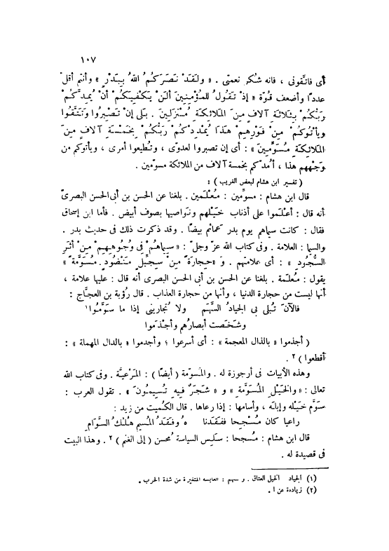 قَالَ ابْنُ هِشَامٍ: مُسَوِّمِينَ: مُعْلَمِينَ. بَلَغَنَا عَنْ الْحَسَنِ بْنِ أَبِي الْحَسَنِ الْبَصْرِيِّ أَنَّهُ قَالَ: أَعْلَمُوا عَلَى أَذْنَابِ خَيْلِهِمْ وَنَوَاصِيهَا بِصُوفِ أَبْيَضَ. فَأَمَّا ابْنُ إسْحَاقَ فَقَالَ: كَانَتْ سِيمَاهُمْ يَوْمَ بَدْرٍ عَمَائِمَ بِيضًا. وَقَدْ ذَكَرْتُ ذَلِكَ فِي حَدِيثِ بَدْرٍ.