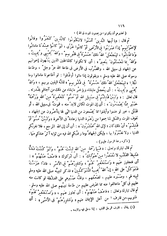 قَالَ تَعَالَى: «وَلَئِنْ قُتِلْتُمْ فِي سَبِيلِ اللَّهِ أَوْ مُتُّمْ لَمَغْفِرَةٌ مِنَ اللَّهِ وَرَحْمَةٌ خَيْرٌ مِمَّا يَجْمَعُونَ» 3: 157: أَيْ إنَّ الْمَوْتَ لَكَائِنٌ لَا بُدَّ مِنْهُ، فَمَوْتٌ فِي سَبِيلِ اللَّهِ، أَوْ قَتْلٌ، خَيْرٌ لَوْ عَلِمُوا وَأَيْقَنُوا مِمَّا يَجْمَعُونَ مِنْ الدُّنْيَا الَّتِي لَهَا يَتَأَخَّرُونَ عَنْ الْجِهَادِ، تَخَوُّفَ الْمَوْتِ وَالْقَتْلِ لِمَا جَمَعُوا مِنْ زَهْرَةِ الدُّنْيَا زَهَادَةً فِي الْآخِرَةِ «وَلَئِنْ مُتُّمْ أَوْ قُتِلْتُمْ 3: 158» أَيُّ ذَلِكَ كَانَ «لَإِلَى اللَّهِ تُحْشَرُونَ 3: 158» : أَيْ أَنَّ إلَى اللَّهِ الْمَرْجِعَ، فَلَا تَغُرَّنَّكُمْ الدُّنْيَا، وَلَا تَغْتَرُّوا بِهَا، وَلْيَكُنْ الْجِهَادُ وَمَا رَغَّبَكُمْ اللَّهُ فِيهِ مِنْ ثَوَابِهِ آثَرَ عِنْدَكُمْ مِنْهَا.