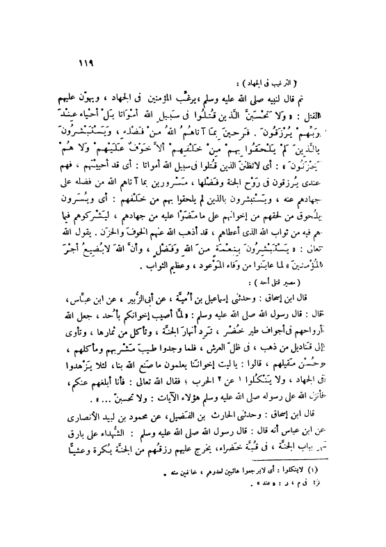 ثُمَّ قَالَ لِنَبِيِّهِ صَلَّى اللهُ عَلَيْهِ وَسَلَّمَ، يُرَغِّبُ الْمُؤْمِنِينَ فِي الْجِهَادِ، وَيُهَوِّنُ عَلَيْهِمْ الْقَتْلَ: وَلا تَحْسَبَنَّ الَّذِينَ قُتِلُوا فِي سَبِيلِ اللَّهِ أَمْواتاً بَلْ أَحْياءٌ عِنْدَ رَبِّهِمْ يُرْزَقُونَ. فَرِحِينَ بِما آتاهُمُ اللَّهُ مِنْ فَضْلِهِ، وَيَسْتَبْشِرُونَ بِالَّذِينَ لَمْ يَلْحَقُوا بِهِمْ مِنْ خَلْفِهِمْ أَلَّا خَوْفٌ عَلَيْهِمْ وَلا هُمْ يَحْزَنُونَ 3: 169- 170: أَيْ لَا تَظُنَّنَّ الَّذِينَ قُتِلُوا فِي سَبِيلِ اللَّهِ أَمْوَاتًا: أَيْ قَدْ أَحْيَيْتهمْ، فَهُمْ عِنْدِي يُرْزَقُونَ فِي رَوْحِ الْجَنَّةِ وَفَضْلِهَا، مَسْرُورِينَ بِمَا آتَاهُمْ اللَّهُ مِنْ فَضْلِهِ عَلَى جِهَادِهِمْ عَنْهُ، وَيَسْتَبْشِرُونَ بِالَّذِينَ لَمْ يَلْحَقُوا بِهِمْ مِنْ خَلْفِهِمْ: أَيْ وَيُسَرُّونَ بِلُحُوقِ مَنْ لَحِقَهُمْ مِنْ إخْوَانِهِمْ عَلَى مَا مَضَوْا عَلَيْهِ مِنْ جِهَادِهِمْ، لِيَشْرَكُوهُمْ فِيمَا هُمْ فِيهِ مِنْ ثَوَابِ اللَّهِ الَّذِي أَعْطَاهُمْ، قَدْ أَذْهَبَ اللَّهُ عَنْهُمْ الْخَوْفَ وَالْحَزَنَ. يَقُولُ اللَّهُ تَعَالَى: يَسْتَبْشِرُونَ بِنِعْمَةٍ مِنَ اللَّهِ وَفَضْلٍ، وَأَنَّ اللَّهَ لَا يُضِيعُ أَجْرَ الْمُؤْمِنِينَ 3: 171 لِمَا عَايَنُوا مِنْ وَفَاءِ الْمَوْعُودِ، وَعَظِيمِ الثَّوَابِ.