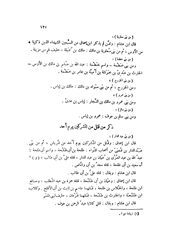 قَالَ ابْنُ إسْحَاقَ: وَقُتِلَ مِنْ الْمُشْرِكِينَ يَوْمَ أُحُدٍ مِنْ قُرَيْشٍ، ثُمَّ مِنْ بَنِي عَبْدِ الدَّارِ بْنِ قُصَيٍّ مِنْ أَصْحَابِ اللِّوَاءِ: طَلْحَةُ بْنُ أَبِي طَلْحَةَ، وَاسْمُ أَبِي طَلْحَةَ: