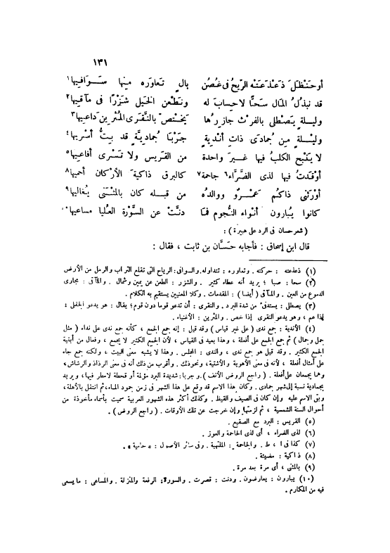 [4] الأندية: جمع ندي (على غير قِيَاس) وَقد قيل: إِنَّه جمع الْجمع، كَأَنَّهُ جمع ندي على نِدَاء (مثل جمل وجمال) ثمَّ جمع الْجمع على أفعلة، وَهَذَا بعيد فِي الْقيَاس، لِأَن الْجمع الْكثير لَا يجمع، وفعال من أبنية الْجمع الْكثير. وَقد قيل هُوَ جمع ندي، والندى: الْمجْلس. وَهَذَا لَا يشبه معنى الْبَيْت، وَلكنه جمع جَاءَ على أَمْثَال أفعلة، لِأَنَّهُ فِي معنى الأهوية والأشتية، وَنَحْو ذَلِك. وَأقرب من ذَلِك أَنه فِي معنى الرذاذ والرشاش، وهما يجمعان على أفعلة. (رَاجع الرَّوْض الْأنف) . وجربا: شَدِيدَة الْبرد مؤلمة أَو قحطة لَا مطر فِيهَا، وَيُرِيد بجمادية نِسْبَة إِلَى شهر جُمَادَى. وَكَانَ هَذَا الِاسْم قد وَقع على هَذَا الشَّهْر فِي زمن جمود المَاء، ثمَّ انْتقل بِالْأَهِلَّةِ، وَبَقِي الِاسْم عَلَيْهِ وَإِن كَانَ فِي الصَّيف والقيظ. وَكَذَلِكَ أَكثر هَذِه الشُّهُور الْعَرَبيَّة سميت بأسماء مَأْخُوذَة من أَحْوَال السّنة الشمسية، ثمَّ لزمتها وَإِن خرجت عَن تِلْكَ الْأَوْقَات. (رَاجع الرَّوْض) .