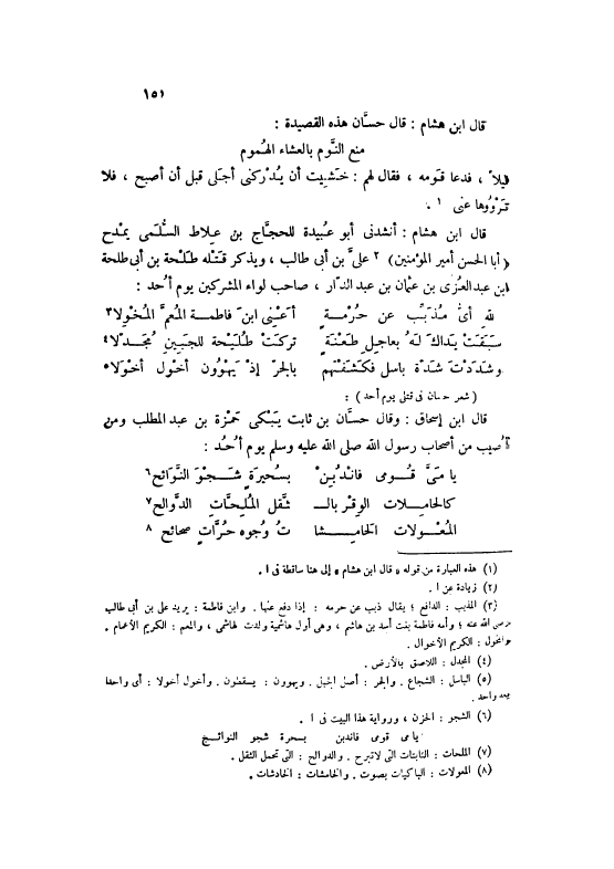 قَالَ ابْنُ إسْحَاقَ: وَقَالَ حَسَّانُ بْنُ ثَابِتٍ يَبْكِي حَمْزَةَ بْنَ عَبْدِ الْمُطَّلِبِ وَمَنْ أُصِيبَ مِنْ أَصْحَابِ رَسُولِ اللَّهِ صَلَّى اللهُ عَلَيْهِ وَسَلَّمَ يَوْمَ أُحُدٍ: