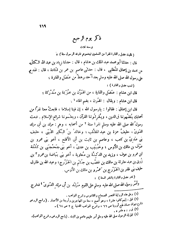 قَالَ: حَدَّثَنَا أَبُو مُحَمَّدٍ عَبْدُ الْمَلِكِ بْنُ هِشَامٍ، قَالَ: حَدَّثَنَا زِيَادُ بْنُ عَبْدِ اللَّهِ الْبَكَّائِيُّ عَنْ مُحَمَّدِ بْنِ إسْحَاقَ الْمُطَّلِبِيِّ، قَالَ: حَدَّثَنِي عَاصِمُ بْنُ عُمَرَ بْنِ قَتَادَةَ، قَالَ: قَدِمَ عَلَى رَسُولِ اللَّهِ صَلَّى اللهُ عَلَيْهِ وَسَلَّمَ بَعْدَ أُحُدٍ رَهْطٌ مِنْ عَضَلٍ وَالْقَارَّةِ.