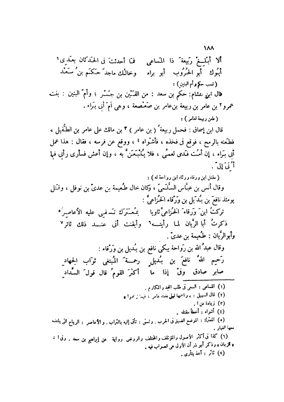 تَرَكْتُ ابْنَ وَرْقَاءَ الْخُزَاعِيَّ ثَاوِيًا ... بِمُعْتَرَكِ تَسْفِي عَلَيْهِ الْأَعَاصِرُ [5]