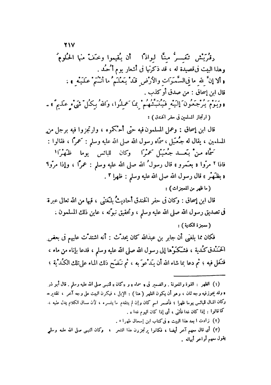 قَالَ ابْنُ إسْحَاقَ: وَكَانَ فِي حَفْرِ الْخَنْدَقِ أَحَادِيثُ بَلَغَتْنِي، فِيهَا مِنْ اللَّهِ تَعَالَى عِبْرَةٌ فِي تَصْدِيقِ رَسُولِ اللَّهِ صَلَّى اللهُ عَلَيْهِ وَسَلَّمَ، وَتَحْقِيقِ نُبُوَّتِهِ، عَايَنَ ذَلِكَ الْمُسْلِمُونَ.