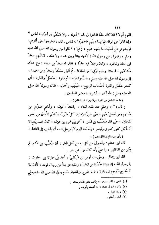 الْقَوْمِ أَمْ لَا؟ فَإِنْ كَانَ حَقًّا فَالْحَنُوا لِي لَحْنًا [1] أَعْرِفُهُ، وَلَا تَفُتُّوا فِي أَعْضَادِ النَّاسِ [2] وَإِنْ كَانُوا عَلَى الْوَفَاءِ فِيمَا بَيْنَنَا وَبَيْنَهُمْ فَاجْهَرُوا بِهِ لِلنَّاسِ. قَالَ: فَخَرَجُوا حَتَّى أَتَوْهُمْ، فَوَجَدُوهُمْ عَلَى أَخْبَثِ مَا بَلَغَهُمْ عَنْهُمْ، (فِيمَا) [3] نَالُوا مِنْ رَسُولِ اللَّهِ صَلَّى اللهُ عَلَيْهِ وَسَلَّمَ، وَقَالُوا: مَنْ رَسُولُ اللَّهِ؟ لَا عَهْدَ بَيْنَنَا وَبَيْنَ مُحَمَّدٍ وَلَا عَقْدَ. فَشَاتَمَهُمْ سَعْدُ ابْن مُعَاذٍ وَشَاتَمُوهُ، وَكَانَ رَجُلًا فِيهِ حِدَّةٌ، فَقَالَ لَهُ سَعْدُ بْنُ عُبَادَةَ: دَعْ عَنْكَ مُشَاتَمَتَهُمْ، فَمَا بَيْنَنَا وَبَيْنَهُمْ أَرْبَى [4] مِنْ الْمُشَاتَمَةِ. ثُمَّ أَقْبَلَ سَعْدٌ وَسَعْدٌ وَمَنْ مَعَهُمَا، إلَى رَسُولِ اللَّهِ صَلَّى اللهُ عَلَيْهِ وَسَلَّمَ، فَسَلَّمُوا عَلَيْهِ، ثُمَّ قَالُوا: عَضَلٌ وَالْقَارَّةُ، أَيْ كَغَدْرِ عَضَلٍ وَالْقَارَّةِ بِأَصْحَابِ الرَّجِيعِ، خُبَيْبٍ وَأَصْحَابِهِ، فَقَالَ رَسُولُ اللَّهِ صَلَّى اللهُ عَلَيْهِ وَسَلَّمَ: اللَّهُ أَكْبَرُ، أَبْشِرُوا يَا مَعْشَرَ الْمُسْلِمِينَ.