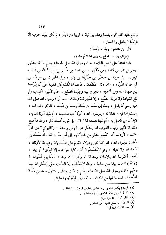 فَلَمَّا اشْتَدَّ عَلَى النَّاسِ الْبَلَاءُ، بَعَثَ رَسُولُ اللَّهِ صَلَّى اللهُ عَلَيْهِ وَسَلَّمَ، كَمَا حَدَّثَنِي عَاصِمُ بْنُ عُمَرَ بْنِ قَتَادَةَ وَمَنْ لَا أَتَّهِمُ، عَنْ مُحَمَّدِ بْنِ مُسْلِمِ بْنِ عُبَيْدِ [2] اللَّهِ بْنِ شِهَابٍ الزُّهْرِيِّ، إلَى عُيَيْنَةَ بْنِ حِصْنِ بْنِ حُذَيْفَةَ بْنِ بَدْرٍ، وَإِلَى الْحَارِثِ بْنِ عَوْفِ بْنِ أَبِي حَارِثَةَ الْمُرِّيِّ، وَهُمَا قَائِدَا غَطَفَانَ، فَأَعْطَاهُمَا ثُلُثَ ثِمَارِ الْمَدِينَةِ عَلَى أَنْ يَرْجِعَا بِمَنْ مَعَهُمَا عَنْهُ وَعَنْ أَصْحَابِهِ، فَجَرَى بَيْنَهُ وَبَيْنَهُمَا الصُّلْحُ، حَتَّى كَتَبُوا الْكِتَابَ وَلَمْ تَقَعْ الشَّهَادَةُ وَلَا عَزِيمَةُ الصُّلْحِ، إلَّا الْمُرَاوَضَةُ فِي ذَلِكَ. فَلَمَّا أَرَادَ رَسُولُ اللَّهِ صَلَّى اللهُ عَلَيْهِ وَسَلَّمَ أَنْ يَفْعَلَ، بَعَثَ إلَى سَعْدِ بْنِ مُعَاذٍ وَسَعْدِ بْنِ عُبَادَةَ، فَذَكَرَ ذَلِكَ لَهُمَا، وَاسْتَشَارَهُمَا فِيهِ، فَقَالَا لَهُ: يَا رَسُولَ اللَّهِ، أَمْرًا نُحِبُّهُ فَنَصْنَعُهُ، أَمْ شَيْئًا أَمَرَكَ اللَّهُ بِهِ، لَا بُدَّ لَنَا مِنْ الْعَمَلِ بِهِ، أَمْ شَيْئًا تَصْنَعُهُ لَنَا؟ قَالَ: بَلْ شَيْءٌ أَصْنَعُهُ لَكُمْ، وَاَللَّهِ مَا أَصْنَعُ ذَلِكَ إلَّا لِأَنَّنِي رَأَيْتُ الْعَرَبَ قَدْ رَمَتْكُمْ عَنْ قَوْسٍ وَاحِدَةٍ، وَكَالَبُوكُمْ [3] مِنْ كُلِّ جَانِبٍ، فَأَرَدْتُ أَنْ أَكْسِرَ عَنْكُمْ مِنْ شَوْكَتِهِمْ إلَى أَمْرٍ مَا، فَقَالَ لَهُ سَعْدُ بْنُ مُعَاذٍ: يَا رَسُولَ اللَّهِ، قَدْ كُنَّا نَحْنُ وَهَؤُلَاءِ الْقَوْمُ عَلَى الشِّرْكِ باللَّه وَعِبَادَةِ الْأَوْثَانِ، لَا نَعْبُدُ اللَّهَ وَلَا نَعْرِفُهُ، وَهُمْ لَا يَطْمَعُونَ أَنْ يَأْكُلُوا مِنْهَا تَمْرَةً إلَّا قِرًى [4] أَوْ بَيْعًا، أَفَحِينَ أَكْرَمْنَا اللَّهُ بِالْإِسْلَامِ وَهَدَانَا لَهُ وَأَعَزَّنَا بِكَ وَبِهِ، نُعْطِيهِمْ أَمْوَالَنَا! (وَاَللَّهِ) [5] مَا لَنَا بِهَذَا مِنْ حَاجَةٍ، وَاَللَّهِ لَا نُعْطِيهِمْ إلَّا السَّيْفَ حَتَّى يَحْكُمَ اللَّهُ بَيْنَنَا وَبَيْنَهُمْ، قَالَ رَسُولُ اللَّهِ صَلَّى اللهُ عَلَيْهِ وَسَلَّمَ: فَأَنْتَ وَذَاكَ. فَتَنَاوَلَ سَعْدُ بْنُ مُعَاذٍ الصَّحِيفَةَ، فَمَحَا مَا فِيهَا مِنْ الْكِتَابِ، ثُمَّ قَالَ: لِيَجْهَدُوا عَلَيْنَا.