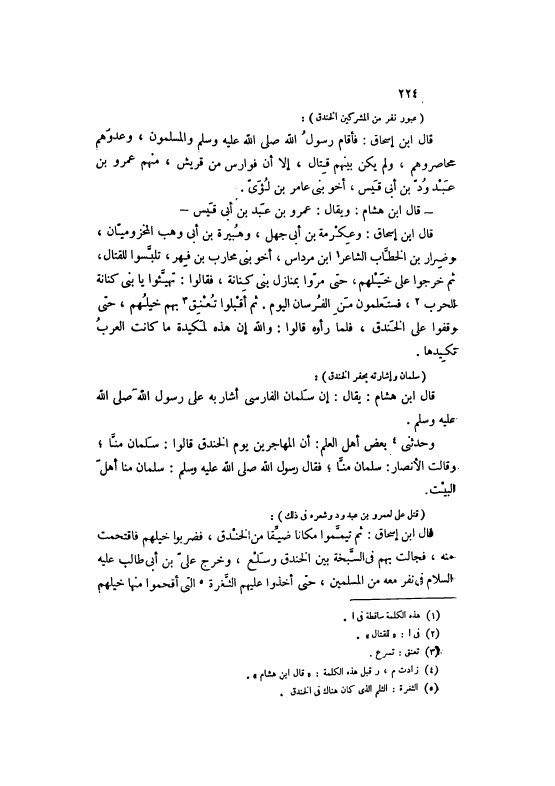 قَالَ ابْنُ إسْحَاقَ: ثُمَّ تَيَمَّمُوا مَكَانًا ضَيِّقًا مِنْ الْخَنْدَقِ، فَضَرَبُوا خَيْلَهُمْ فَاقْتَحَمَتْ مِنْهُ، فَجَالَتْ بِهِمْ فِي السَّبْخَةِ بَيْنَ الْخَنْدَقِ وَسَلْعٍ، وَخَرَجَ عَلِيُّ بْنُ أَبِي طَالِبٍ عَلَيْهِ السَّلَامُ فِي نَفَرٍ مَعَهُ مِنْ الْمُسْلِمِينَ، حَتَّى أَخَذُوا عَلَيْهِمْ الثَّغْرَةَ [5] الَّتِي أَقْحَمُوا مِنْهَا خَيْلَهُمْ