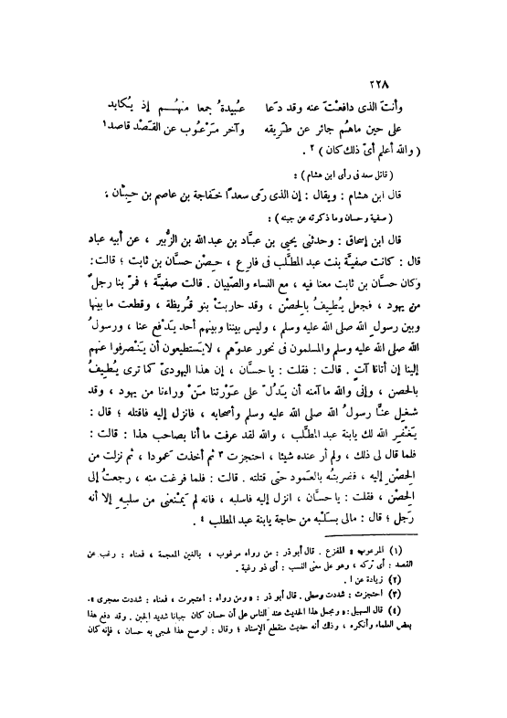 وَكَانَ حَسَّانُ بْنُ ثَابِتٍ مَعَنَا فِيهِ، مَعَ النِّسَاءِ وَالصِّبْيَانِ. قَالَتْ صَفِيَّةُ، فَمَرَّ بِنَا رَجُلٌ مِنْ يَهُودَ، فَجَعَلَ يُطِيفُ بِالْحِصْنِ، وَقَدْ حَارَبَتْ بَنُو قُرَيْظَةَ، وَقَطَعَتْ مَا بَيْنَهَا وَبَيْنَ رَسُولِ اللَّهِ صَلَّى اللهُ عَلَيْهِ وَسَلَّمَ، وَلَيْسَ بَيْنَنَا وَبَيْنَهُمْ أَحَدٌ يَدْفَعُ عَنَّا، وَرَسُولُ اللَّهِ صَلَّى اللهُ عَلَيْهِ وَسَلَّمَ وَالْمُسْلِمُونَ فِي نُحُورِ عَدُوِّهِمْ، لَا يَسْتَطِيعُونَ أَنْ يَنْصَرِفُوا عَنْهُمْ إلَيْنَا إنْ أَتَانَا آتٍ. قَالَتْ: فَقُلْتُ: يَا حَسَّانُ، إنَّ هَذَا الْيَهُودِيَّ كَمَا تَرَى يُطِيفُ بِالْحِصْنِ، وَإِنِّي وَاَللَّهِ مَا آمَنُهُ أَنْ يَدُلَّ عَلَى عَوْرَتِنَا مَنْ وَرَاءَنَا مِنْ يَهُودَ، وَقَدْ شُغِلَ عَنَّا رَسُولُ اللَّهِ صَلَّى اللهُ عَلَيْهِ وَسَلَّمَ وَأَصْحَابُهُ، فَانْزِلْ إلَيْهِ فَاقْتُلْهُ، قَالَ: