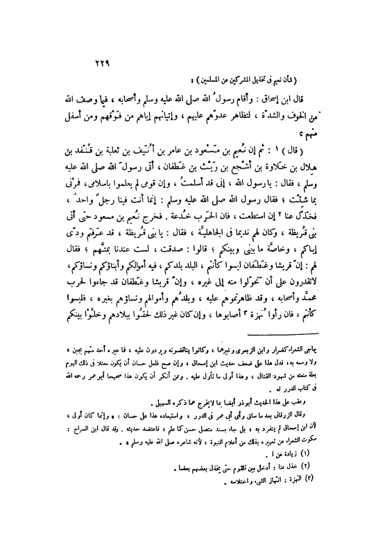 (قَالَ) [1] : ثُمَّ إنَّ نُعَيْمَ بْنَ مَسْعُودِ بْنِ عَامِرِ بْنِ أُنَيْفِ بْنِ ثَعْلَبَةَ بْنِ قُنْفُدِ بْنِ هِلَالِ بْنِ خَلَاوَةَ بْنِ أَشْجَعَ بْنِ رَيْثِ بْنِ غَطَفَانَ، أَتَى رَسُولَ اللَّهِ صَلَّى اللهُ عَلَيْهِ وَسَلَّمَ، فَقَالَ: يَا رَسُولَ اللَّهِ، إنِّي قَدْ أَسْلَمْتُ، وَإِنَّ قَوْمِي لَمْ يَعْلَمُوا بِإِسْلَامِي، فَمُرْنِي بِمَا شِئْتُ، فَقَالَ رَسُولُ اللَّهِ صَلَّى اللهُ عَلَيْهِ وَسَلَّمَ: إنَّمَا أَنْتُ فِينَا رَجُلٌ وَاحِدٌ، فَخَذِّلْ عَنَّا [2] إنْ اسْتَطَعْتُ، فَإِنَّ الْحَرْبَ خُدْعَةٌ. فَخَرَجَ نُعَيْمُ بْنُ مَسْعُودٍ حَتَّى أَتَى بَنِي قُرَيْظَةَ، وَكَانَ لَهُمْ نَدِيمًا فِي الْجَاهِلِيَّةِ، فَقَالَ: يَا بَنِي قُرَيْظَةَ، قَدْ عَرَفْتُمْ وُدِّي إيَّاكُمْ، وَخَاصَّةً مَا بَيْنِي وَبَيْنَكُمْ، قَالُوا: صَدَقْتُ، لَسْتُ عِنْدَنَا بِمُتَّهَمٍ، فَقَالَ لَهُمْ: إنَّ قُرَيْشًا وَغَطَفَانَ لَيْسُوا كَأَنْتُمْ، الْبَلَدُ بَلَدُكُمْ، فِيهِ أَمْوَالُكُمْ وَأَبْنَاؤُكُمْ وَنِسَاؤُكُمْ، لَا تَقْدِرُونَ عَلَى أَنْ تَحَوَّلُوا مِنْهُ إلَى غَيْرِهِ، وَإِنَّ قُرَيْشًا وَغَطَفَانَ قَدْ جَاءُوا لِحَرْبِ مُحَمَّدٍ وَأَصْحَابِهِ، وَقَدْ ظَاهَرْتُمُوهُمْ عَلَيْهِ، وَبَلَدُهُمْ وَأَمْوَالُهُمْ وَنِسَاؤُهُمْ بِغَيْرِهِ، فَلَيْسُوا كَأَنْتُمْ، فَإِنْ رَأَوْا نُهْزَةً [3] أَصَابُوهَا، وَإِنْ كَانَ غَيْرَ ذَلِكَ لَحِقُوا بِبِلَادِهِمْ وَخَلَّوْا بَيْنَكُمْ