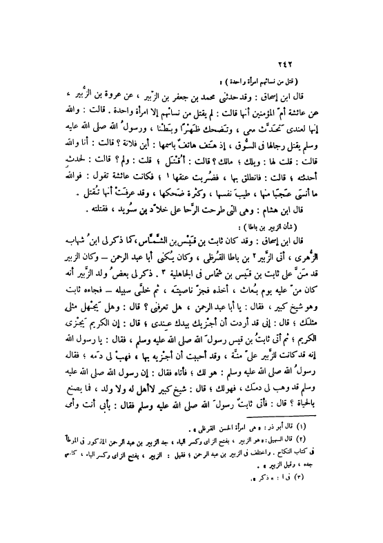 قَالَ ابْنُ إسْحَاقَ: وَقَدْ حَدَّثَنِي مُحَمَّدُ بْنُ جَعْفَرِ بْنِ الزُّبَيْرِ، عَنْ عُرْوَةَ بْنِ الزُّبَيْرِ، عَنْ عَائِشَةَ أُمِّ الْمُؤْمِنِينَ أَنَّهَا قَالَتْ: لَمْ يُقْتَلْ مِنْ نِسَائِهِمْ إلَّا امْرَأَةٌ وَاحِدَةٌ. قَالَتْ: وَاَللَّهِ إِنَّهَا لعندي تحدّث مَعِي، وَتَضْحَكُ ظَهْرًا وَبَطْنًا، وَرَسُولُ اللَّهِ صَلَّى اللهُ عَلَيْهِ وَسَلَّمَ يَقْتُلُ رِجَالَهَا فِي السُّوقِ، إذْ هَتَفَ هَاتِفٌ بِاسْمِهَا: أَيْنَ فُلَانَةُ؟ قَالَتْ: أَنَا وَاَللَّهِ قَالَتْ: قُلْتُ لَهَا: وَيلك، مَالك؟ قَالَتْ: أُقْتَلُ، قُلْتُ: وَلِمَ؟ قَالَتْ: لِحَدَثِ أَحْدَثْتُهُ، قَالَتْ: فَانْطَلَقَ بِهَا، فَضُرِبَتْ عُنُقُهَا [1] ، فَكَانَتْ عَائِشَة تَقول: فو الله مَا أَنْسَى عَجَبًا مِنْهَا، طِيبَ نَفْسِهَا، وَكَثْرَةَ ضَحِكِهَا، وَقَدْ عَرَفَتْ أَنَّهَا تُقْتَلُ.