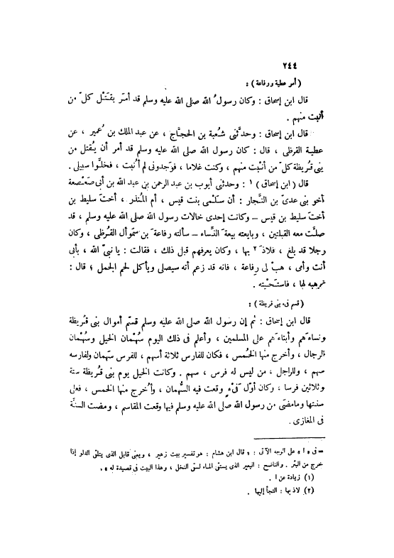 قَالَ ابْنُ إسْحَاقَ: ثُمَّ إنَّ رَسُولَ اللَّهِ صَلَّى اللهُ عَلَيْهِ وَسَلَّمَ قَسَمَ أَمْوَالَ بَنِي قُرَيْظَةَ وَنِسَاءَهُمْ وَأَبْنَاءَهُمْ عَلَى الْمُسْلِمِينَ، وَأَعْلَمَ فِي ذَلِكَ الْيَوْمِ سُهْمَانَ الْخَيْلِ وَسُهْمَانَ الرِّجَالِ، وَأَخْرَجَ مِنْهَا الْخُمُسَ، فَكَانَ لِلْفَارِسِ ثَلَاثَةُ أَسْهُمٍ، لِلْفَرَسِ سَهْمَانِ وَلِفَارِسِهِ سَهْمٌ، وَلِلرَّاجِلِ، مَنْ لَيْسَ لَهُ فَرَسٌ، سَهْمٌ. وَكَانَتْ الْخَيْلُ يَوْمَ بَنِي قُرَيْظَةَ سِتَّةً وَثَلَاثِينَ فَرَسًا، وَكَانَ أَوَّلَ فَيْءٍ وَقَعَتْ فِيهِ السُّهْمَانُ، وَأُخْرِجَ مِنْهَا الْخُمْسُ، فَعَلَى سُنَّتِهَا وَمَا مَضَى مِنْ رَسُولِ اللَّهِ صَلَّى اللهُ عَلَيْهِ وَسَلَّمَ فِيهَا وَقَعَتْ الْمَقَاسِمُ، وَمَضَتْ السُّنَّةُ فِي الْمَغَازِي.