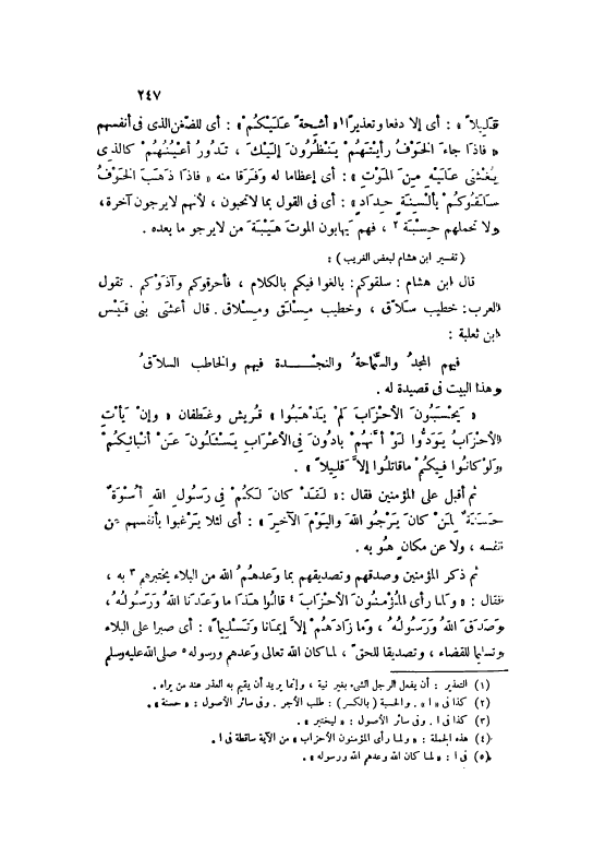 أَيْ إلَّا دَفْعًا وَتَعْذِيرًا [1] «أَشِحَّةً عَلَيْكُمْ 33: 19» : أَيْ لِلضَّغَنِ الَّذِي فِي أَنْفُسِهِمْ «فَإِذا جاءَ الْخَوْفُ رَأَيْتَهُمْ يَنْظُرُونَ إِلَيْكَ، تَدُورُ أَعْيُنُهُمْ كَالَّذِي يُغْشى عَلَيْهِ مِنَ الْمَوْتِ 33: 19» : أَيْ إعْظَامًا لَهُ وَفَرَقًا مِنْهُ «فَإِذا ذَهَبَ الْخَوْفُ سَلَقُوكُمْ بِأَلْسِنَةٍ حِدادٍ 33: 19» : أَيْ فِي الْقَوْلِ بِمَا لَا تُحِبُّونَ، لِأَنَّهُمْ لَا يَرْجُونَ آخِرَةً، وَلَا تَحْمِلهُمْ حِسْبَةٌ [2] ، فَهُمْ يَهَابُونَ الْمَوْتَ هَيْبَةَ مَنْ لَا يَرْجُو مَا بَعْدَهُ.