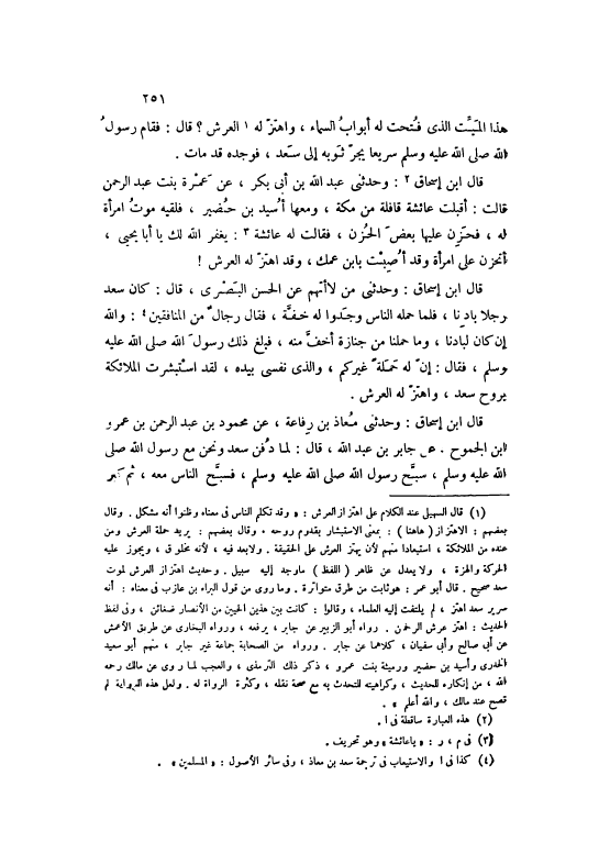 قَالَ ابْنُ إسْحَاقَ [2] : وَحَدَّثَنِي عَبْدُ اللَّهِ بْنُ أَبِي بَكْرٍ، عَنْ عَمْرَةَ بِنْتِ عَبْدِ الرَّحْمَنِ قَالَتْ: أَقْبَلَتْ عَائِشَةُ قَافِلَةً مِنْ مَكَّةَ، وَمَعَهَا أُسَيْدُ بْنُ حُضَيْرٍ، فَلَقِيَهُ مَوْتُ امْرَأَةٍ لَهُ، فَحَزِنَ عَلَيْهَا بَعْضَ الْحُزْنِ، فَقَالَتْ لَهُ عَائِشَةُ [3] : يَغْفِرُ اللَّهُ لَكَ يَا أَبَا يَحْيَى، أَتَحْزَنُ عَلَى امْرَأَةٍ وَقَدْ أُصِبْتُ بِابْنِ عَمِّكَ، وَقَدْ اهْتَزَّ لَهُ الْعَرْشُ! قَالَ ابْنُ إسْحَاقَ: وَحَدَّثَنِي مَنْ لَا أَتَّهِمُ عَنْ الْحَسَنِ الْبَصْرِيِّ، قَالَ: كَانَ سَعْدٌ رَجُلًا بَادِنًا، فَلَمَّا حَمَلَهُ النَّاسُ وَجَدُوا لَهُ خِفَّةً، فَقَالَ رِجَالٌ مِنْ الْمُنَافِقِينَ [4] : وَاَللَّهِ إنْ كَانَ لَبَادِنَا، وَمَا حَمَلْنَا مِنْ جِنَازَةٍ أَخَفَّ مِنْهُ، فَبَلَغَ ذَلِكَ رَسُولَ اللَّهِ صَلَّى اللهُ عَلَيْهِ وَسَلَّمَ، فَقَالَ: إنَّ لَهُ حَمَلَةً غَيْرَكُمْ، وَاَلَّذِي نَفْسِي بِيَدِهِ، لَقَدْ اسْتَبْشَرَتْ الْمَلَائِكَةُ بِرُوحِ سَعْدٍ، وَاهْتَزَّ لَهُ الْعَرْشُ. قَالَ ابْنُ إسْحَاقَ: وَحَدَّثَنِي مُعَاذُ بْنُ رِفَاعَةَ، عَنْ مَحْمُودِ بْنِ عَبْدِ الرَّحْمَنِ بْنِ عَمْرِو ابْن الْجَمُوحِ، عَنْ جَابِرِ بْنِ عَبْدِ اللَّهِ، قَالَ: لَمَّا دُفِنَ سَعْدٌ وَنَحْنُ مَعَ رَسُولِ اللَّهِ صَلَّى اللهُ عَلَيْهِ وَسَلَّمَ، سَبَّحَ رَسُولُ اللَّهِ صَلَّى اللهُ عَلَيْهِ وَسَلَّمَ، فَسَبَّحَ النَّاسُ مَعَهُ، ثُمَّ كَبَّرَ