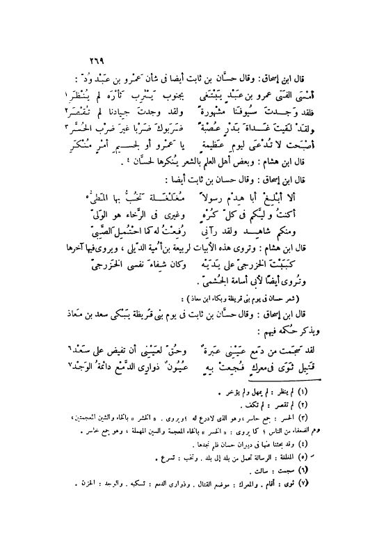قَالَ ابْنُ إسْحَاقَ: وَقَالَ حَسَّانُ بْنُ ثَابِتٍ فِي يَوْمِ بَنِي قُرَيْظَةَ يَبْكِي سَعْدَ بْنَ مُعَاذٍ وَيَذْكُرُ حُكْمَهُ فِيهِمْ: