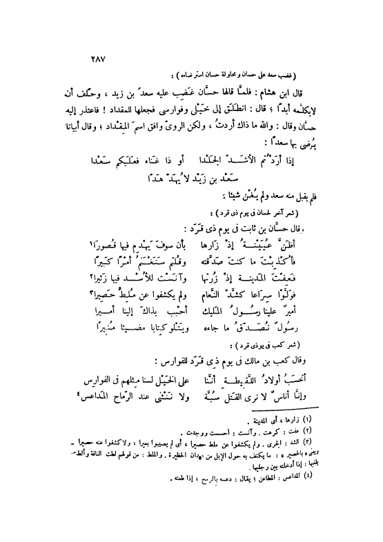 قَالَ ابْنُ هِشَامٍ: فَلَمَّا قَالَهَا حَسَّانُ غَضِبَ عَلَيْهِ سَعْدُ بْنُ زَيْدٍ، وَحَلَفَ أَنْ لَا يُكَلِّمَهُ أَبَدًا، قَالَ: انْطَلَقَ إلَى خَيْلِي وَفَوَارِسِي فَجَعَلَهَا لِلْمِقْدَادِ! فَاعْتَذَرَ إلَيْهِ حَسَّانُ وَقَالَ: وَاَللَّهِ مَا ذَاكَ أَرَدْتُ، وَلَكِنَّ الرَّوِيَّ وَافَقَ اسْمَ الْمِقْدَادِ، وَقَالَ أَبْيَاتًا يُرْضِي بِهَا سَعْدًا: