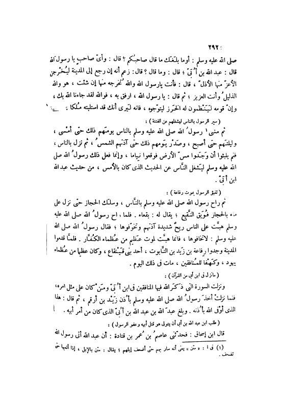 صَلَّى اللهُ عَلَيْهِ وَسَلَّمَ: أَوْ مَا بَلَغَكَ مَا قَالَ صَاحِبُكُمْ؟ قَالَ: وَأَيُّ صَاحِبٍ يَا رَسُولَ اللَّهِ قَالَ: عَبْدُ اللَّهِ بْنُ أُبَيٍّ، قَالَ: وَمَا قَالَ؟ قَالَ: زَعَمَ أَنَّهُ إنْ رَجَعَ إلَى الْمَدِينَةِ لَيُخْرِجَنَّ الْأَعَزُّ مِنْهَا الْأَذَلَّ، قَالَ: فَأَنْتَ يَا رَسُولَ اللَّهِ وَاَللَّهِ تُخْرِجُهُ مِنْهَا إنْ شِئْتُ. هُوَ وَاَللَّهِ الذَّلِيلُ وَأَنْتَ الْعَزِيزُ، ثُمَّ قَالَ: يَا رَسُولَ اللَّهِ، ارْفُقْ بِهِ، فو الله لَقَدْ جَاءَنَا اللَّهُ بِكَ، وَإِنَّ قَوْمَهُ لَيَنْظِمُونَ لَهُ الْخَرَزَ لِيُتَوِّجُوهُ، فَإِنَّهُ لَيَرَى أَنَّكَ قَدْ اسْتَلَبْتَهُ مُلْكًا.