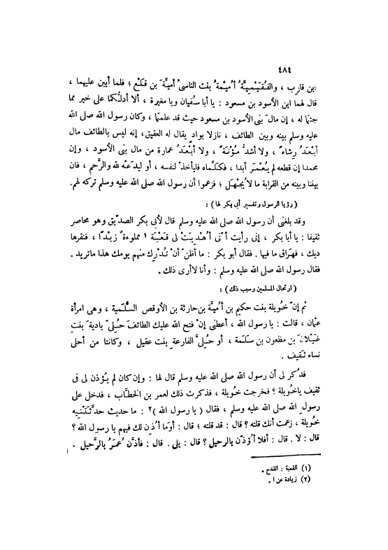 فَذُكِرَ لِي أَنَّ رَسُولَ اللَّهِ صَلَّى اللهُ عَلَيْهِ وَسَلَّمَ قَالَ لَهَا: وَإِنْ كَانَ لَمْ يُؤْذَنْ لِي فِي ثَقِيفٍ يَا خُوَيْلَةُ؟ فَخَرَجَتْ خُوَيْلَةُ، فَذَكَرَتْ ذَلِكَ لِعُمَرَ بْنِ الْخَطَّابِ، فَدَخَلَ عَلَى رَسُولِ اللَّهِ صَلَّى اللهُ عَلَيْهِ وَسَلَّمَ، فَقَالَ (يَا رَسُولَ اللَّهِ) [2] : مَا حَدِيثٌ حَدَّثَتْنِيهِ خُوَيْلَةُ، زَعَمَتْ أَنَّكَ قُلْتَهُ؟ قَالَ: قَدْ قُلْتَهُ، قَالَ: أَوَمَا أُذِنَ لَكَ فِيهِمْ يَا رَسُولَ اللَّهِ؟