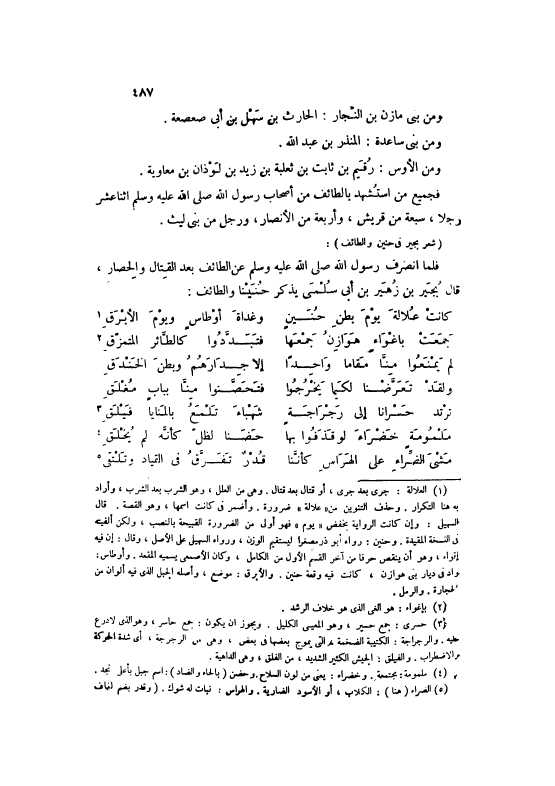 فَلَمَّا انْصَرَفَ رَسُولُ اللَّهِ صَلَّى اللهُ عَلَيْهِ وَسَلَّمَ عَنْ الطَّائِفِ بَعْدَ الْقِتَالِ وَالْحِصَارِ، قَالُ بُجَيْرُ بْنُ زُهَيْرِ بْنِ أَبِي سُلْمَى يَذْكُرُ حُنَيْنًا وَالطَّائِفَ: