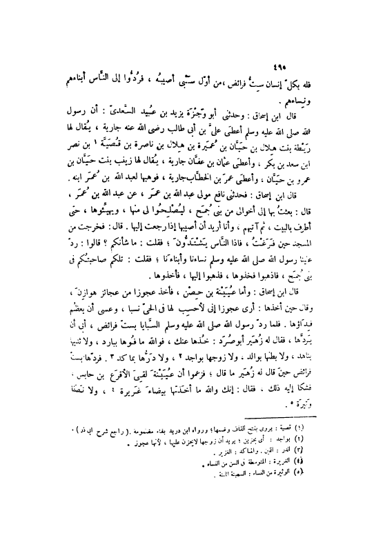 فَلَهُ بِكُلِّ إنْسَانٍ سِتُّ فَرَائِضَ، مِنْ أَوَّلِ سَبْيٍ أُصِيبُهُ، فَرَدُّوا إلَى النَّاسِ أَبْنَاءَهُمْ وَنِسَاءَهُمْ. قَالَ ابْنُ إسْحَاقَ: وَحَدَّثَنِي أَبُو وَجْزَةَ يَزِيدُ بْنُ عُبَيْدٍ السَّعْدِيُّ: أَنَّ رَسُولَ اللَّهِ صَلَّى اللهُ عَلَيْهِ وَسَلَّمَ أَعْطَى عَلِيَّ بْنَ أَبِي طَالِبٍ رَضِيَ اللَّهُ عَنْهُ جَارِيَةً، يُقَالُ لَهَا رَيْطَةُ بِنْتُ هِلَالِ بْنِ حَيَّانَ بْنِ عُمَيْرَةَ بْنِ هِلَالِ بْنِ نَاصِرَةَ بْنِ قُصَيَّةَ [1] بْنِ نَصْرِ ابْن سَعْدِ بْنِ بَكْرٍ، وَأَعْطَى عُثْمَانَ بْنَ عَفَّانَ جَارِيَةً، يُقَالُ لَهَا زَيْنَبُ بِنْتُ حَيَّانَ بْنِ عَمْرِو بْنِ حَيَّانَ، وَأَعْطَى عُمَرَ بْنَ الْخَطَّابِ جَارِيَةً، فَوَهَبَهَا لِعَبْدِ اللَّهِ بْنِ عُمَرَ ابْنِهِ.