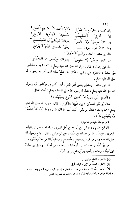 قَالَ ابْنُ إسْحَاقَ: فَقَالَ رَسُولُ اللَّهِ صَلَّى اللهُ عَلَيْهِ وَسَلَّمَ: اذْهَبُوا بِهِ، فَاقْطَعُوا عَنِّي لِسَانَهُ، فَأَعْطَوْهُ حَتَّى رَضِيَ، فَكَانَ ذَلِكَ قَطْعَ لِسَانِهِ الَّذِي أَمَرَ بِهِ رَسُولُ اللَّهِ صَلَّى اللهُ عَلَيْهِ وَسَلَّمَ. قَالَ ابْنُ هِشَامٍ: وَحَدَّثَنِي بَعْضُ أَهْلِ الْعِلْمِ: أَنَّ عَبَّاسَ بْنَ مِرْدَاسٍ أَتَى رَسُولَ اللَّهِ صَلَّى اللهُ عَلَيْهِ وَسَلَّمَ، فَقَالَ لَهُ رَسُولُ اللَّهِ صَلَّى اللهُ عَلَيْهِ وَسَلَّمَ: أَنْتَ الْقَائِلُ: