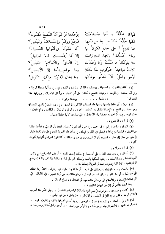 [1] الْخلَّة (بِالضَّمِّ) : الصديقة. يُوصف بِهِ الْمُذكر والمؤنث والمفرد وَغَيره. يُرِيد أَنَّهَا صديقَة كَرِيمَة، وَلَو أَنَّهَا صدقت فِي الْوَعْد، وَقبلت النصح، لكَانَتْ على أتم الْخلال، وأكمل الْأَحْوَال. وَرِوَايَة هَذَا للبيت فِي أ: «ويلمها.... بوعدها وَلَو ان ... »