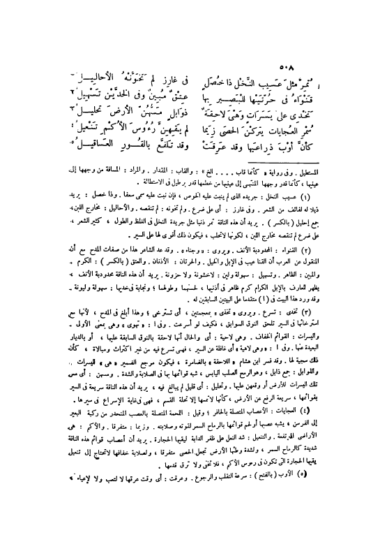 [1] عسيب النّخل: جَرِيدَة الّذي لم ينْبت عَلَيْهِ الخوص، فَإِن نبت عَلَيْهِ سمى سَعَفًا. وَذَا خصل: يُرِيد ذيلا لَهُ لفائف من الشّعْر. وَفِي غارز: أَي على ضرع. وَلم تخونه: لم تنقصه. والأحاليل: مخارج اللَّبن، جمع إحليل (بِالْكَسْرِ) . يُرِيد أَن هَذِه النَّاقة تمر ذَنبا مثل جَرِيدَة النّخل فِي الغلظ والطول، كثير الشّعْر، على ضرع لم تنقصه مخارج اللَّبن، لكَونهَا لَا تحلب، فَيكون ذَلِك أقوى لَهَا على السّير.