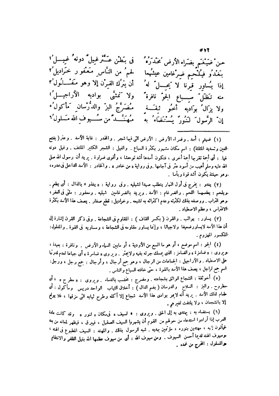 [1] ضيغم: أَسد. وضراء الأَرْض: الأَرْض الَّتِي فِيهَا شجر. والمخدر: غابة الْأسد. وعتر (بِفَتْح الْعين وَتَشْديد الْمُثَلَّثَة) : اسْم مَكَان مَشْهُور بِكَثْرَة السبَاع. والغيل: الشّجر الْكثير الملتف. وغيل دونه غيل: أَي أجمة تَقربهَا أجمة أُخْرَى، فَتكون أسدها أَشد توحشا، وَأقوى ضراوة. يُرِيد أَن رَسُول الله صَلَّى اللهُ عَلَيْهِ وَسَلَّمَ أهيب من أسود عثر فِي آجامها. وَفِي رِوَايَة «من خادر» . والخادر: الْأسد الدَّاخِل فِي خدره، وَهُوَ حِينَئِذٍ يكون أَشد قُوَّة وبأسا.