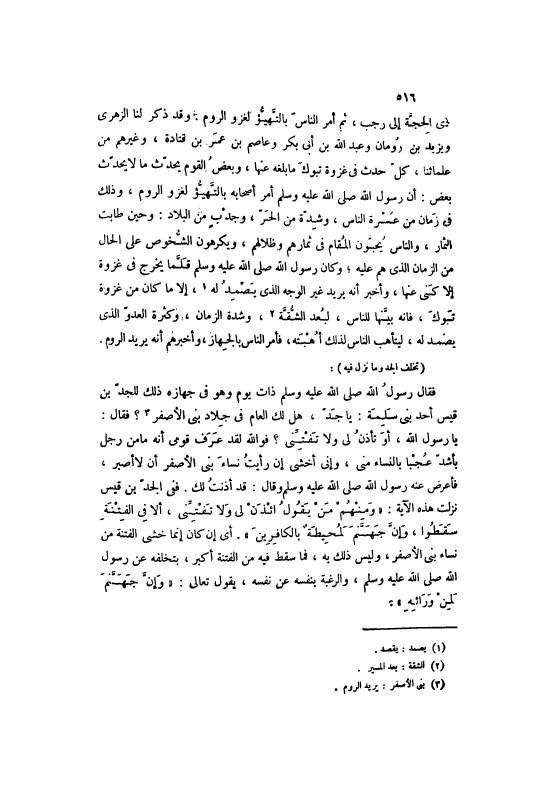 ذِي الْحَجَّةِ إلَى رَجَبٍ، ثُمَّ أَمَرَ النَّاسَ بِالتَّهَيُّؤِ لِغَزْوِ الرُّومِ. وَقَدْ ذَكَرَ لَنَا الزُّهْرِيُّ وَيَزِيدُ بْنُ رُومَانَ وَعَبْدُ اللَّهِ بْنُ أَبِي بَكْرٍ وَعَاصِمُ بْنُ عُمَرَ بْنِ قَتَادَةَ، وَغَيْرُهُمْ مِنْ عُلَمَائِنَا، كُلٌّ حَدَّثَ فِي غَزْوَةِ تَبُوكَ مَا بَلَغَهُ عَنْهَا، وَبَعْضُ الْقَوْمِ يُحَدِّثُ مَا لَا يُحَدِّثُ بَعْضٌ: أَنَّ رَسُولَ اللَّهِ صَلَّى اللهُ عَلَيْهِ وَسَلَّمَ أَمَرَ أَصْحَابَهُ بِالتَّهَيُّؤِ لِغَزْوِ الرُّومِ، وَذَلِكَ فِي زَمَانٍ مِنْ عُسْرَةِ النَّاسِ، وَشِدَّةٍ مِنْ الْحَرِّ، وَجَدْبٍ مِنْ الْبِلَادِ: وَحِينَ طَابَتْ الثِّمَارُ، وَالنَّاسُ يُحِبُّونَ الْمُقَامَ فِي ثِمَارِهِمْ وَظِلَالِهِمْ، وَيَكْرَهُونَ الشُّخُوصَ عَلَى الْحَالِ مِنْ الزَّمَانِ الَّذِي هُمْ عَلَيْهِ، وَكَانَ رَسُولُ اللَّهِ صَلَّى اللهُ عَلَيْهِ وَسَلَّمَ قَلَّمَا يَخْرُجُ فِي غَزْوَةٍ إلَّا كَنَّى عَنْهَا، وَأَخْبَرَ أَنَّهُ يُرِيدُ غَيْرَ الْوَجْهِ الَّذِي يَصْمُدُ لَهُ [1] ، إلَّا مَا كَانَ مِنْ غَزْوَةِ تَبُوكَ، فَإِنَّهُ بَيَّنَهَا لِلنَّاسِ، لِبُعْدِ الشُّقَّةِ [2] ، وَشِدَّةِ الزَّمَانِ، وَكَثْرَةِ الْعَدُوِّ الَّذِي يَصْمُدُ لَهُ، لِيَتَأَهَّبَ النَّاسُ لِذَلِكَ أُهْبَتَهُ، فَأَمَرَ النَّاسَ بِالْجِهَازِ، وَأَخْبَرَهُمْ أَنَّهُ يُرِيدُ الرُّومَ.