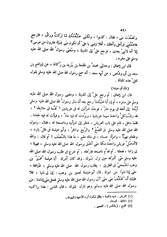 قَالَ ابْنُ إسْحَاقَ: ثُمَّ رَجَعَ عَلِيٌّ إلَى الْمَدِينَةِ، وَمَضَى رَسُولُ اللَّهِ صَلَّى اللهُ عَلَيْهِ وَسَلَّمَ عَلَى سَفَرِهِ، ثُمَّ إنَّ أَبَا خَيْثَمَةَ رَجَعَ بَعْدَ أَنْ سَارَ رَسُولُ اللَّهِ صَلَّى اللهُ عَلَيْهِ وَسَلَّمَ أَيَّامًا إلَى أَهْلِهِ فِي يَوْمٍ حَارٍّ، فَوَجَدَ امْرَأَتَيْنِ لَهُ فِي عَرِيشَيْنِ [1] لَهُمَا فِي حَائِطِهِ [2] ، قَدْ رَشَّتْ كُلُّ وَاحِدَةٍ مِنْهُمَا عَرِيشَهَا، وَبَرَّدَتْ لَهُ فِيهِ مَاءً، وَهَيَّأَتْ لَهُ فِيهِ طَعَامًا.