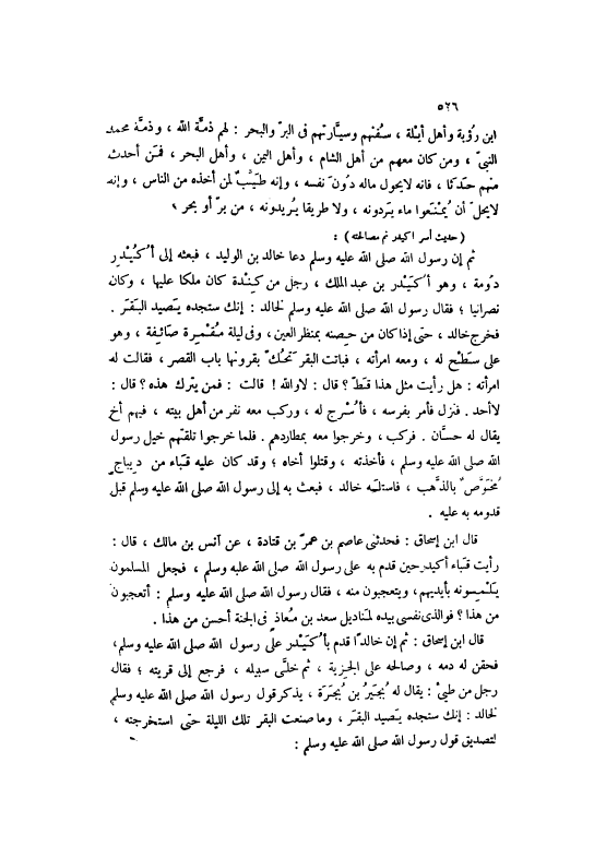 ثُمَّ إنَّ رَسُولَ اللَّهِ صَلَّى اللهُ عَلَيْهِ وَسَلَّمَ دَعَا خَالِدَ بْنَ الْوَلِيدِ، فَبَعَثَهُ إلَى أُكَيْدِرِ دَوْمَةَ، وَهُوَ أُكَيْدِرُ بْنُ عَبْدِ الْمَلِكِ، رَجُلٌ مِنْ كِنْدَةَ كَانَ مَلِكًا عَلَيْهَا، وَكَانَ نَصْرَانِيًّا، فَقَالَ رَسُولُ اللَّهِ صَلَّى اللهُ عَلَيْهِ وَسَلَّمَ لِخَالِدِ: إنَّكَ سَتَجِدُهُ يَصِيدُ الْبَقَرَ. فَخَرَجَ خَالِدٌ، حَتَّى إذَا كَانَ مِنْ حِصْنِهِ بِمَنْظَرِ الْعَيْنِ، وَفِي لَيْلَةٍ مُقْمِرَةٍ صَائِفَةٍ، وَهُوَ عَلَى سَطْحٍ لَهُ، وَمَعَهُ امْرَأَتُهُ، فَبَاتَتْ الْبَقَرُ تَحُكُّ بِقُرُونِهَا بَابَ الْقَصْرِ، فَقَالَتْ لَهُ امْرَأَتُهُ: هَلْ رَأَيْتُ مِثْلَ هَذَا قَطُّ؟ قَالَ: لَا وَاَللَّهِ! قَالَتْ: فَمَنْ يَتْرُكُ هَذِهِ؟ قَالَ: