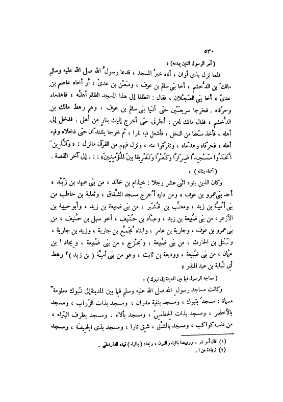 فَلَمَّا نَزَلَ بِذِي أَوَانَ، أَتَاهُ خَبَرُ الْمَسْجِدِ، فَدَعَا رَسُولُ اللَّهِ صَلَّى اللهُ عَلَيْهِ وَسَلَّمَ مَالِكَ بْنَ الدُّخْشُمِ، أَخَا بَنِي سَالِمِ بْنِ عَوْفٍ، وَمَعْنِ بْنِ عَدِيٍّ، أَوْ أَخَاهُ عَاصِمُ بْنُ عَدِيٍّ، أَخَا بَنِي الْعَجْلَانِ، فَقَالَ: انْطَلِقَا إلَى هَذَا الْمَسْجِدِ الظَّالِمِ أَهْلُهُ، فَاهْدِمَاهُ وَحَرِّقَاهُ. فَخَرَجَا سَرِيعَيْنِ حَتَّى أَتَيَا بَنِي سَالِمِ بْنِ عَوْفٍ، وَهُمْ رَهْطُ مَالِكِ بْنِ الدُّخْشُمِ، فَقَالَ مَالِكٌ لِمَعْنِ: أَنْظِرْنِي حَتَّى أخرج إِلَيْك بتار مِنْ أَهْلِي. فَدَخَلَ إلَى أَهْلِهِ، فَأَخَذَ سَعَفًا مِنْ النَّخْلِ، فَأَشْعَلَ فِيهِ نَارًا، ثُمَّ خَرَجَا يَشْتَدَّانِ حَتَّى دَخَلَاهُ وَفِيهِ أَهْلُهُ، فَحَرَّقَاهُ وَهَدَّمَاهُ، وَتَفَرَّقُوا عَنْهُ، وَنَزَلَ فِيهِمْ مِنْ الْقُرْآنِ مَا نَزَلَ: وَالَّذِينَ اتَّخَذُوا مَسْجِداً ضِراراً وَكُفْراً وَتَفْرِيقاً بَيْنَ الْمُؤْمِنِينَ 9: 107 ... إلَى آخِرِ الْقِصَّةِ.